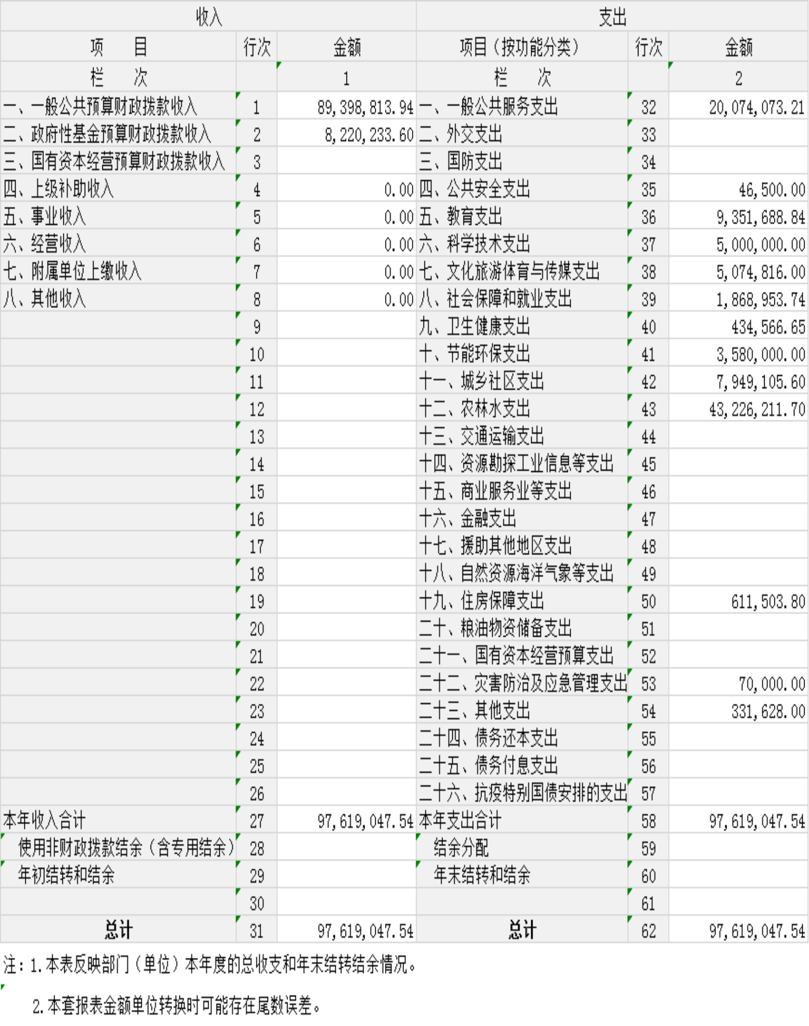 收入总额9722.12万元。按资金性质分,财政拨款收入总额占100.00%,非财政拨款收入总额占0.00%。按收入项目分,年初结转和结余占0.00%,使用非财政拨款结余(含专用结余)占0.00%,一般公共预算财政拨款收入占91.54%,政府性基金预算财政拨款收入占8.46%,国有资本经营预算财政拨款收入占0.00%,上级补助收入占0.00%,事业收入占0.00%,经营收入占0.00%,附属单位上缴收入占0.00%,其他收入占0.00%。
