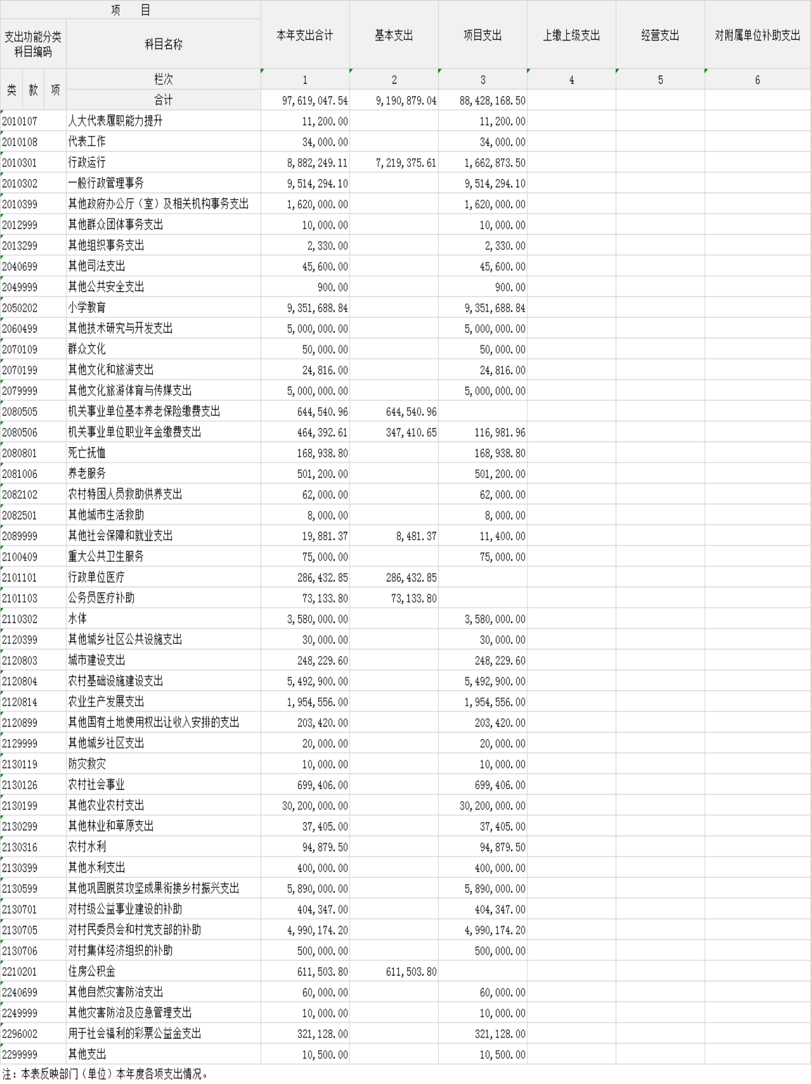 本年支出的具体构成:基本支出919.09万元,占10.39%;项目支出8842.82万元,占89.61%;经营支出0.00万元,占0.00%;上缴上级支出0.00万元,占0.00%;对附属单位补助支出0.00万元,占0.00%。