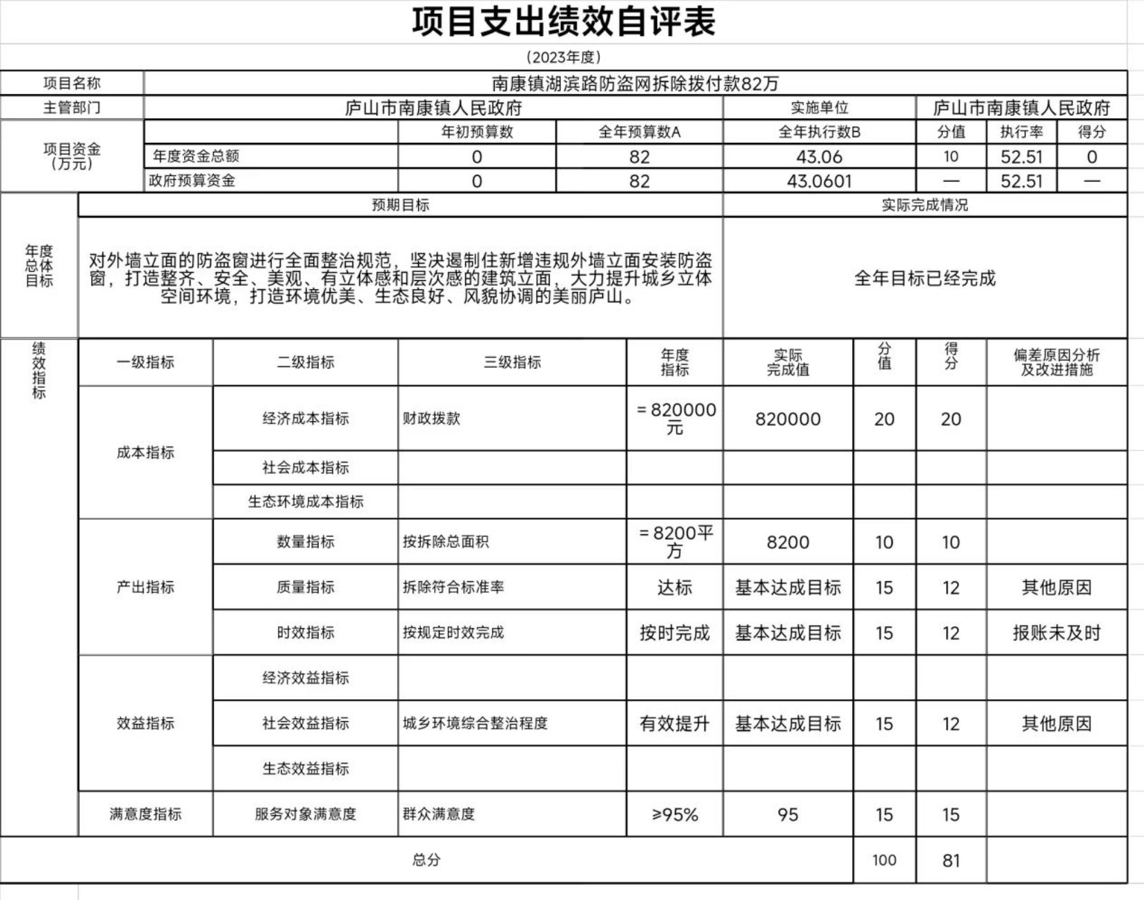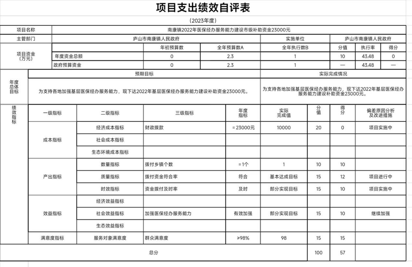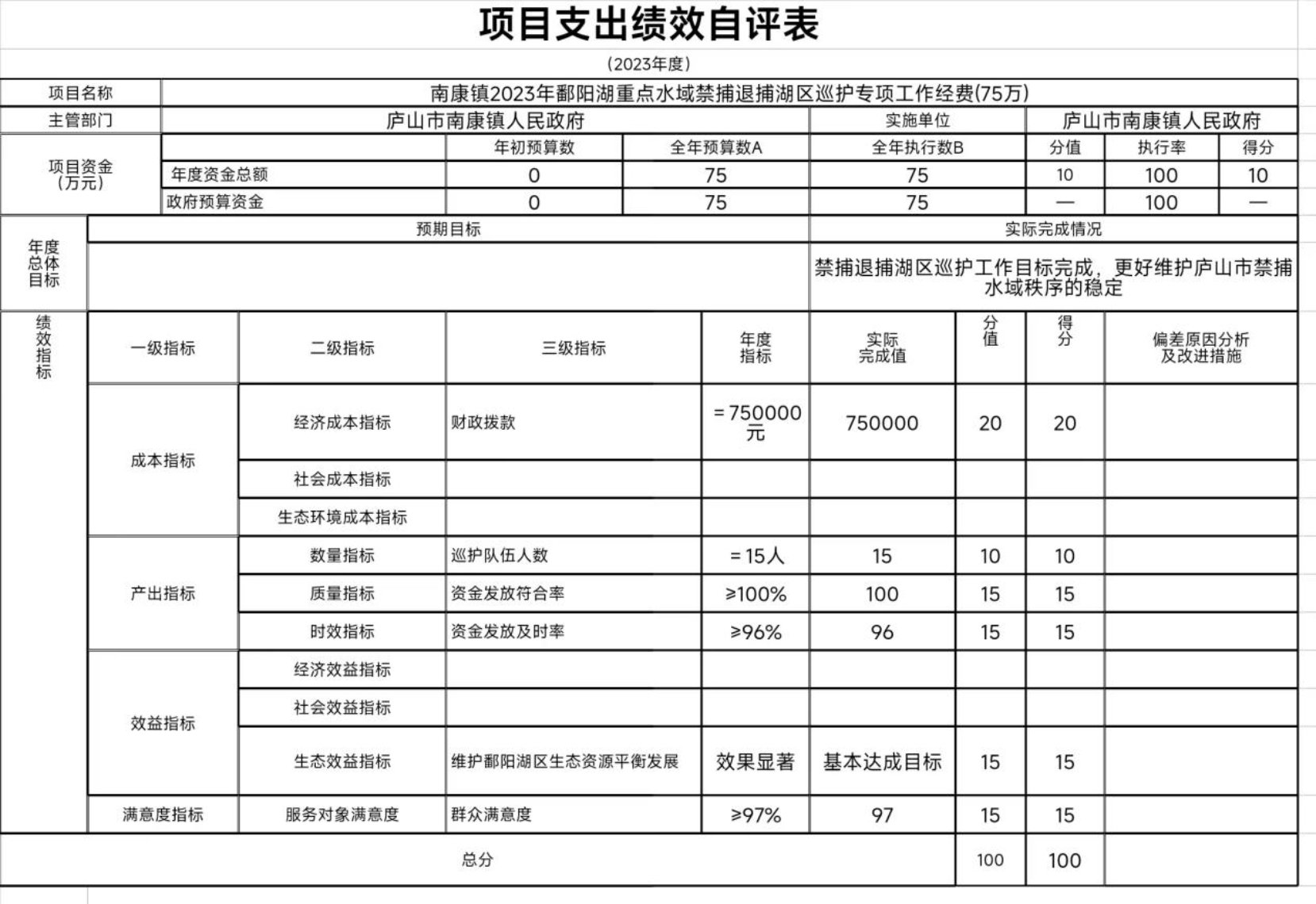 25-本部门“南康镇2023年度鄱阳湖重点水域禁捕退捕湖区巡护专项工作经费资金”项目支出绩效自评结果如下: