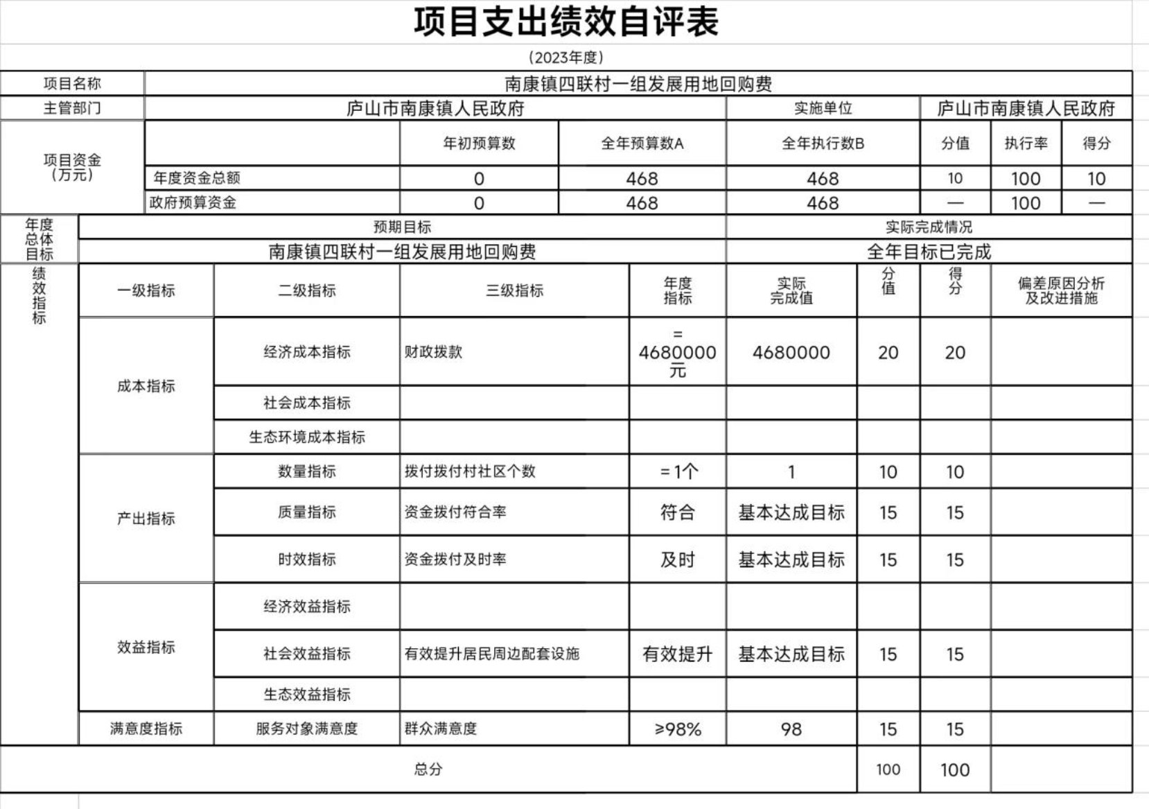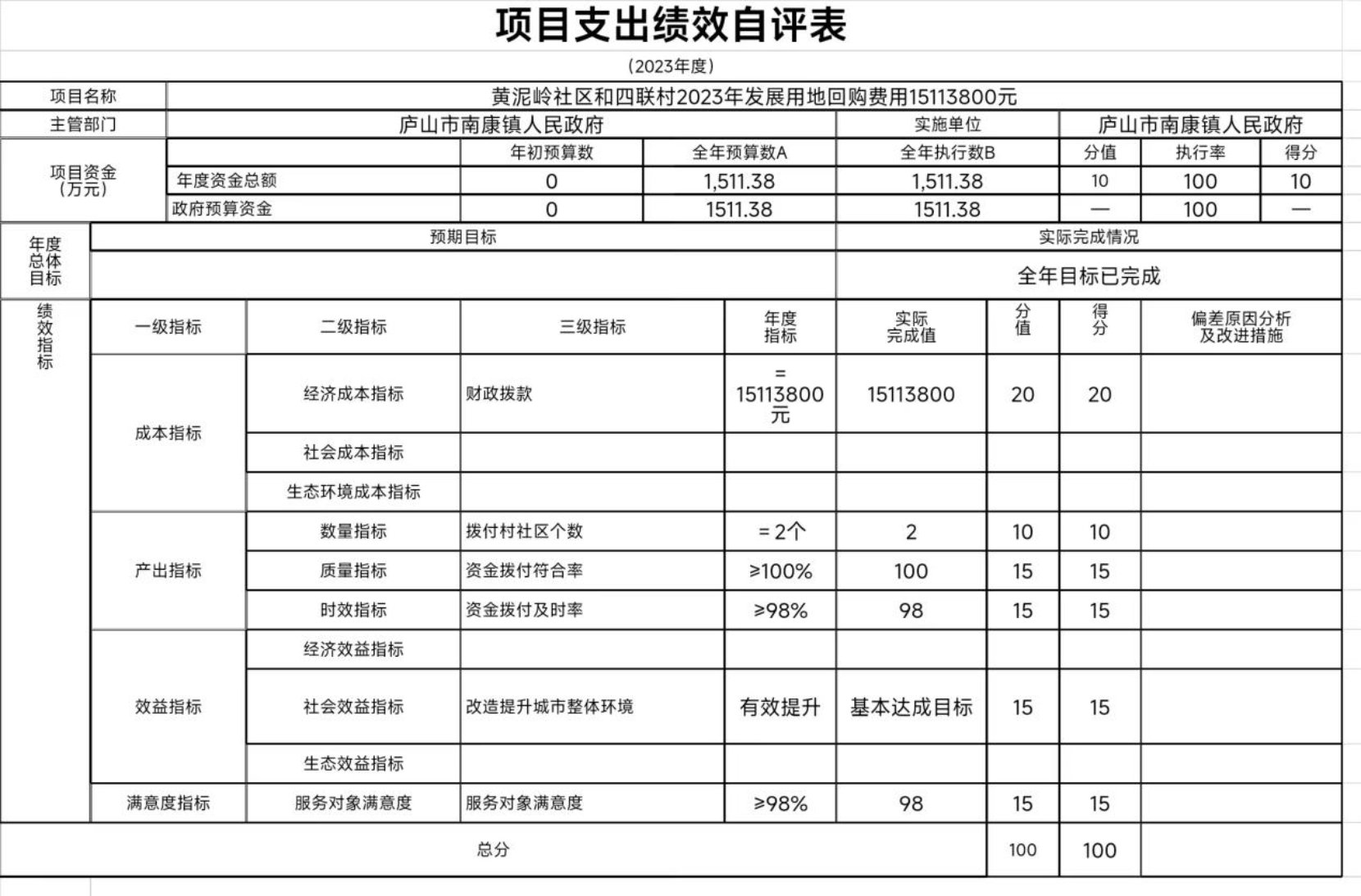31-本部门“南康镇黄泥岭社区和四联村2023年发展用地回购费用资金”项目支出绩效自评结果如下: