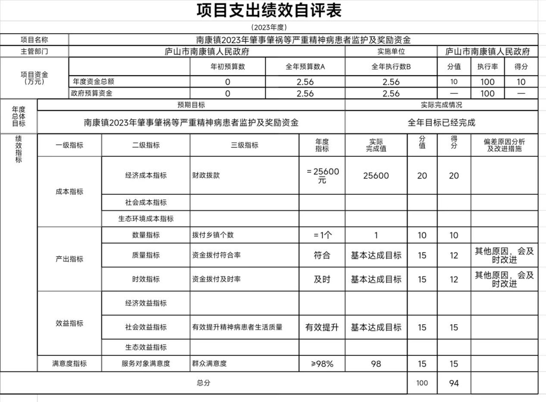 19-本部门“南康镇2022年肇事肇祸等严重精神病患者监护及奖励资金”项目支出绩效自评结果如下:
