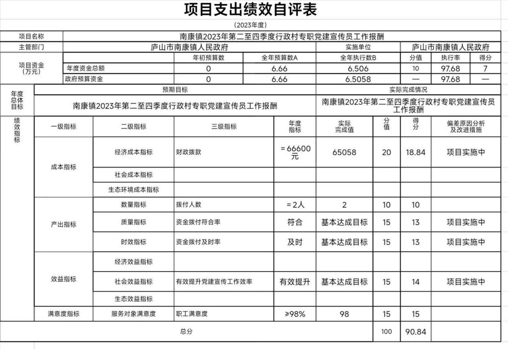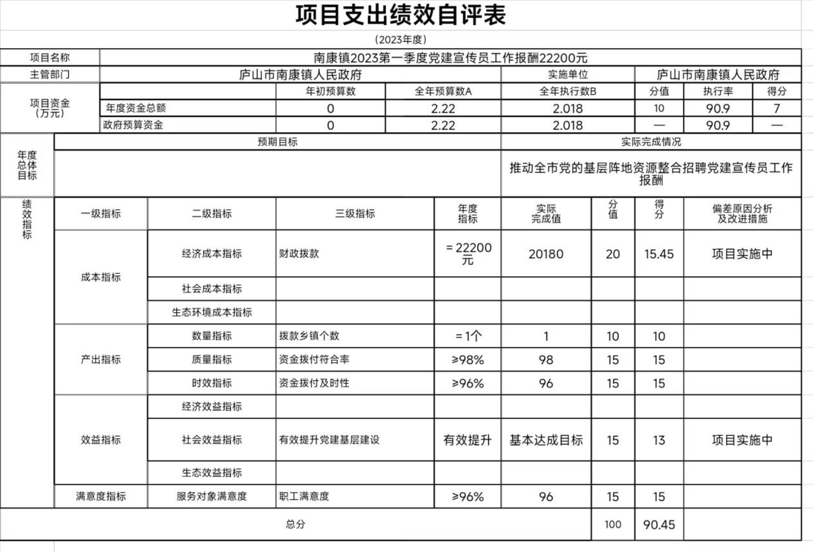26-本部门“南康镇2023年度第一季度党建宣传员工作报酬资金”项目支出绩效自评结果如下: