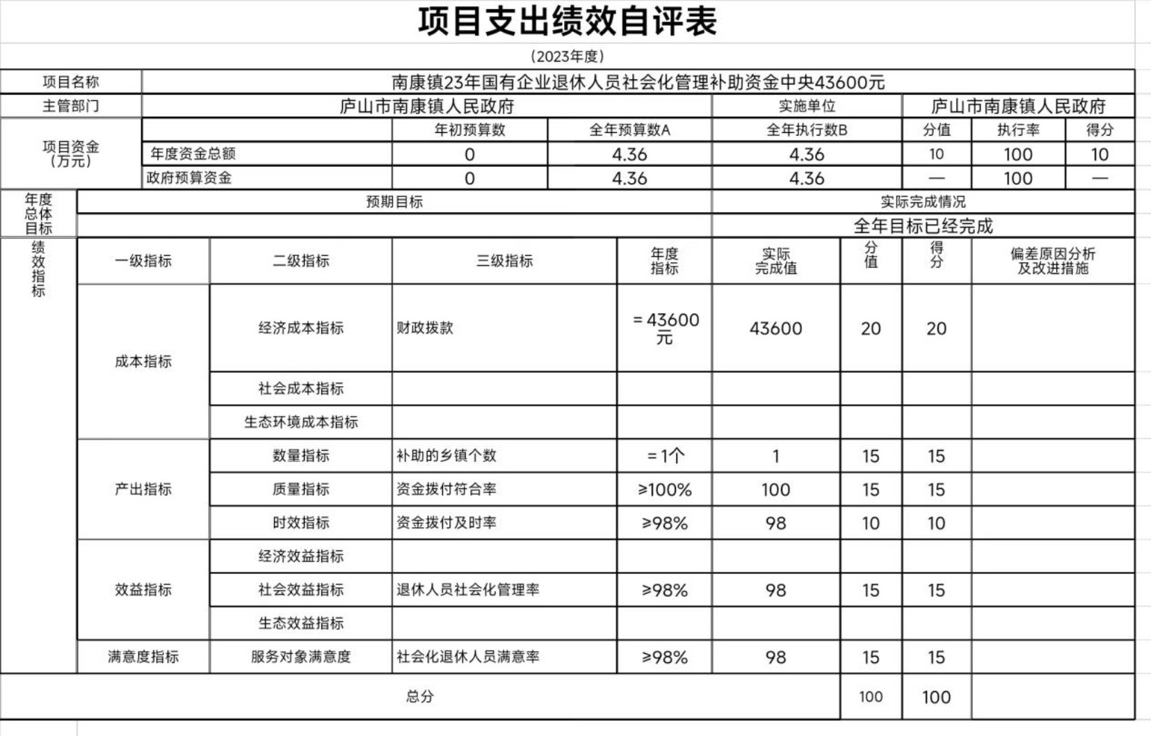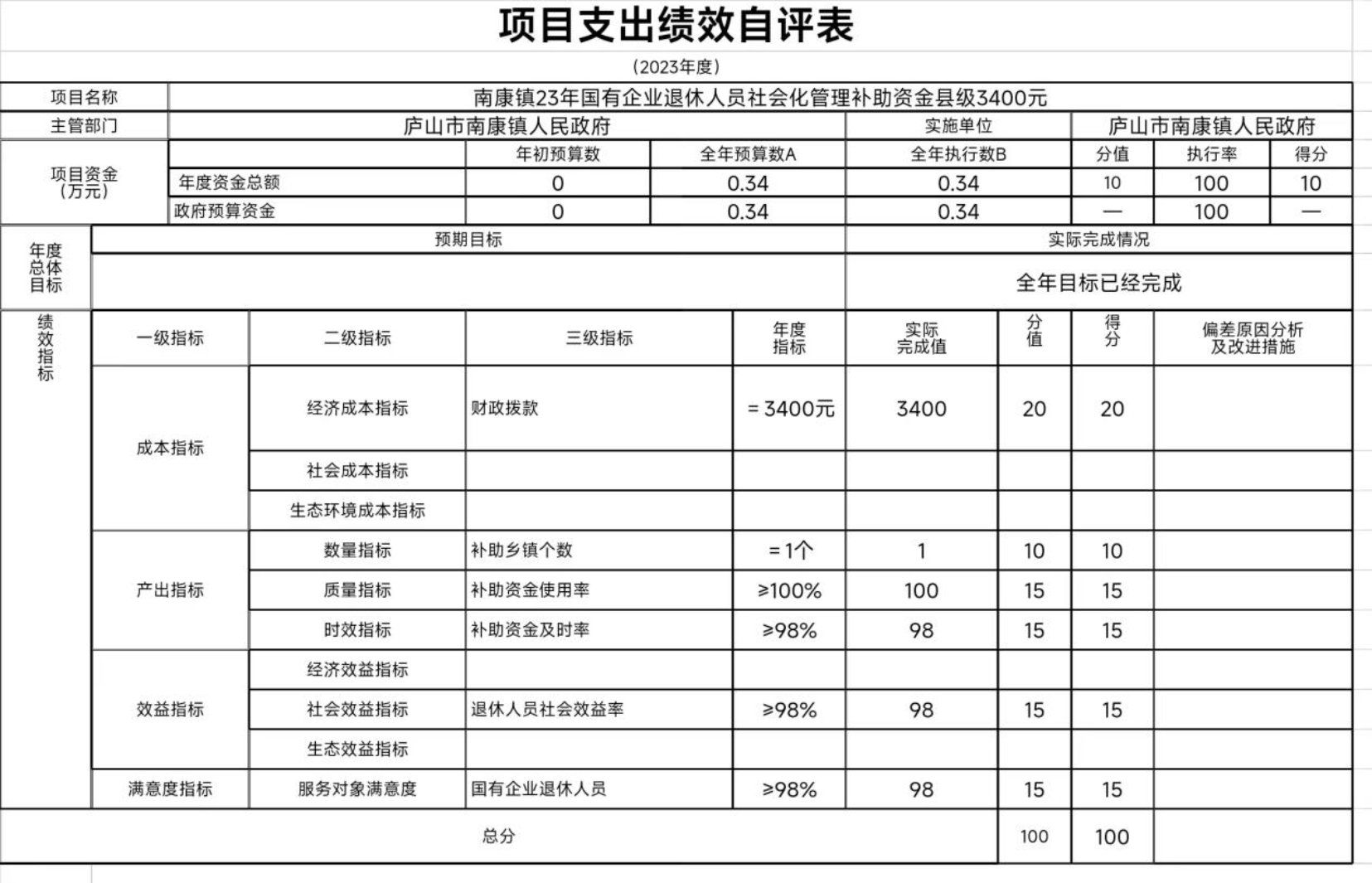23-本部门“南康镇2023国有企业退休人员社会化管理县级补助资金”项目支出绩效自评结果如下: