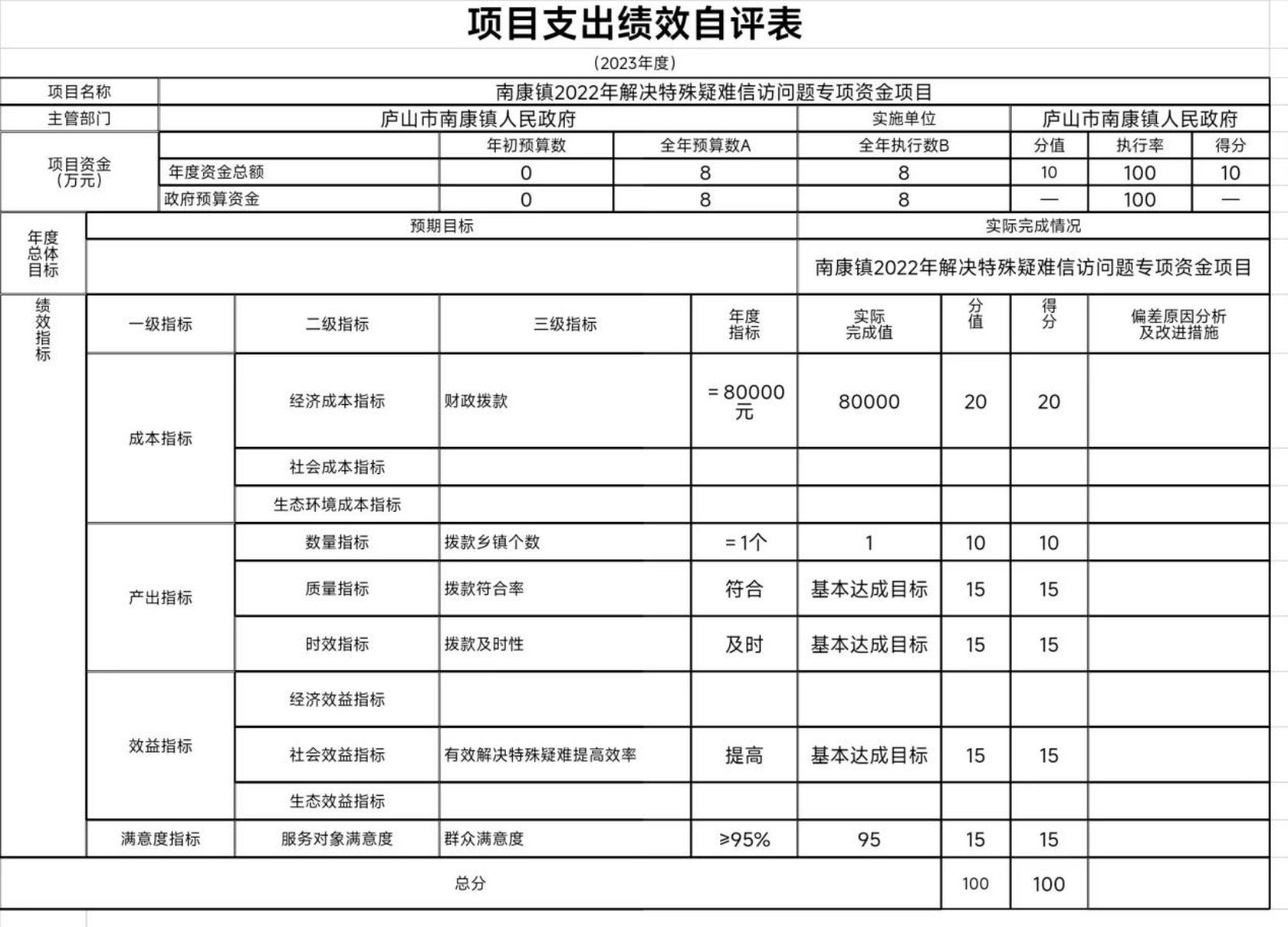 15-本部门“南康镇2022年度解决特殊疑难信访问题专项资金”项目支出绩效自评结果如下: