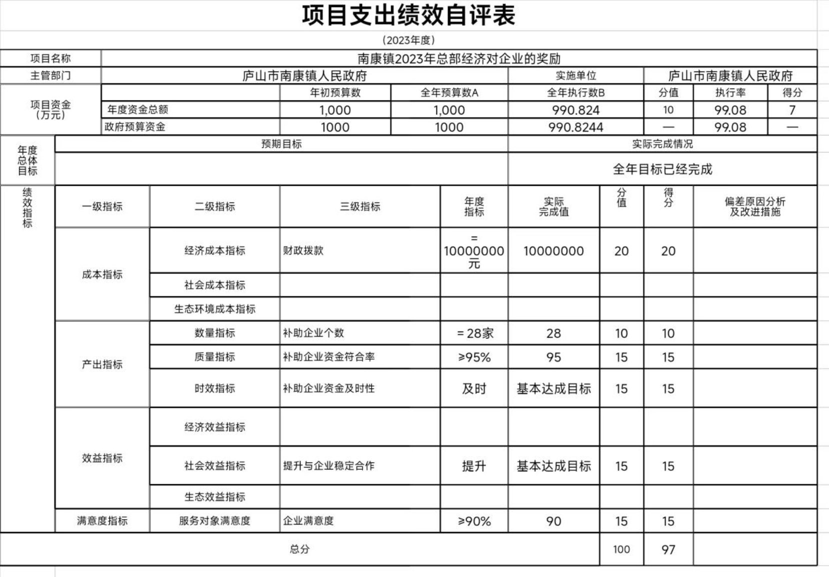 17-本部门“南康镇2023年总部经济对企业的奖励资金”项目支出绩效自评结果如下: