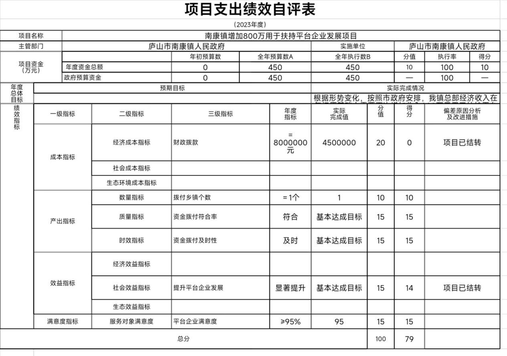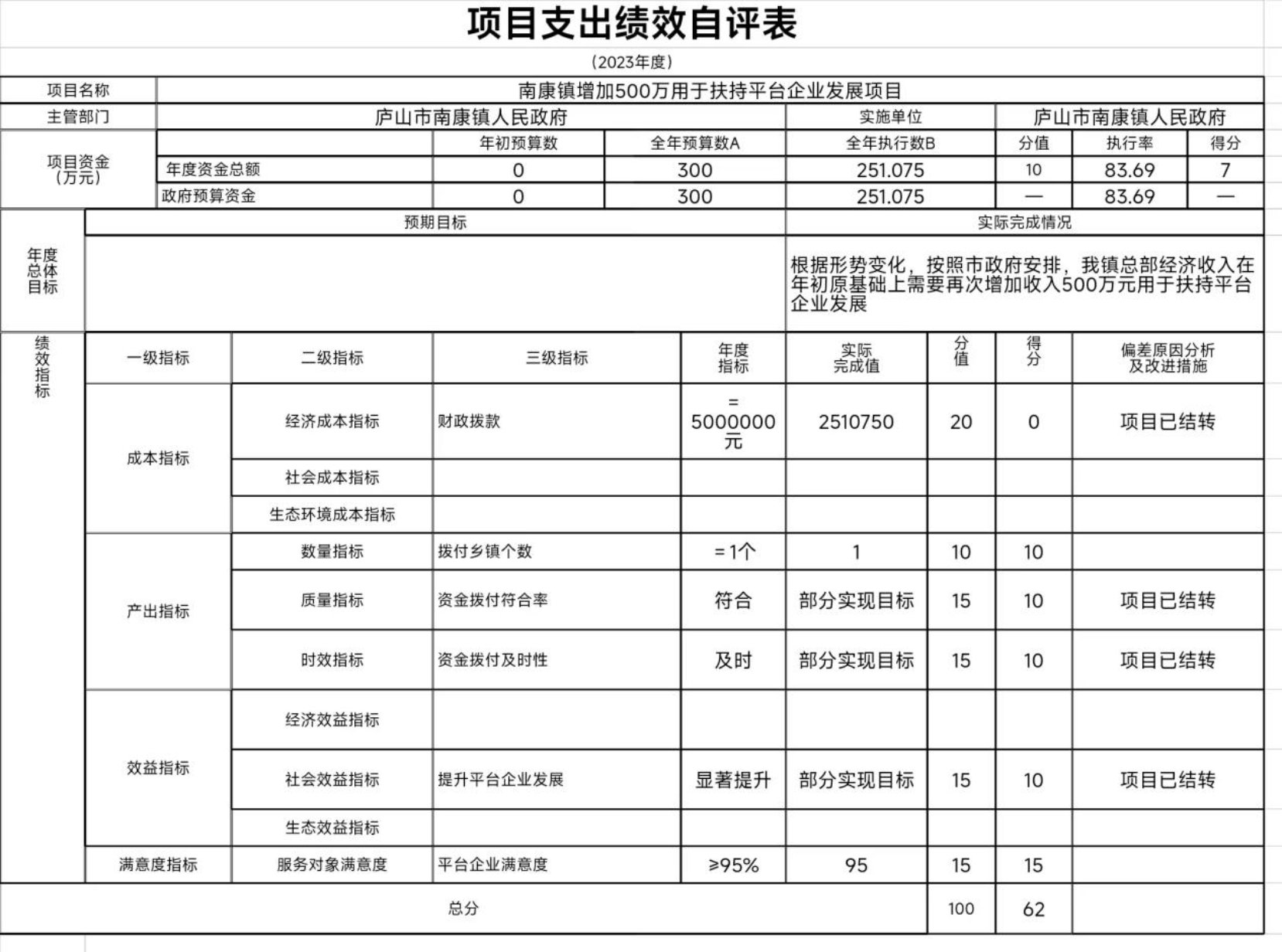 34-本部门“南康镇增加500万元用于扶持平台企业发展项目资金”项目支出绩效自评结果如下: