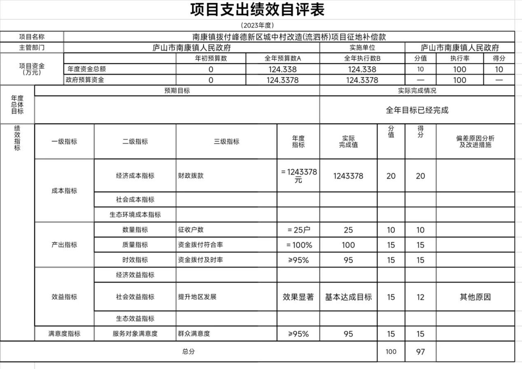20-本部门“南康镇拨付峰德新区城中村改造(流泗桥)项目征地补偿资金”项目支出绩效自评结果如下: