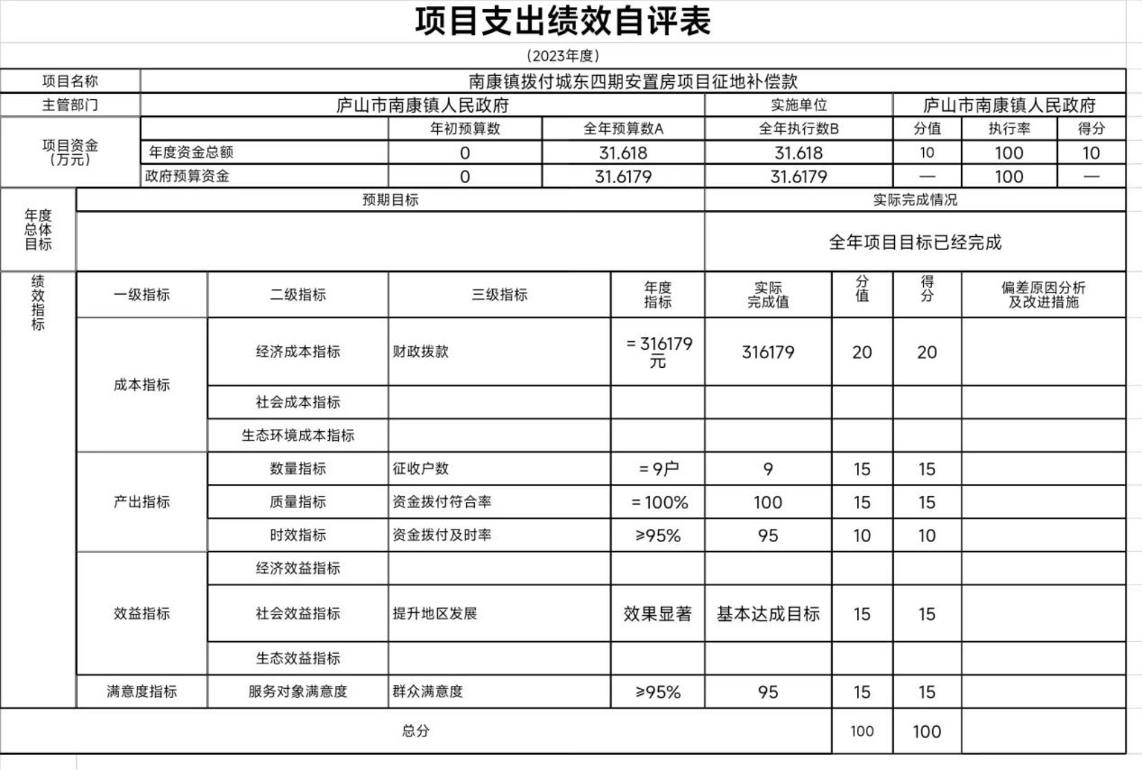 21-本部门“南康镇拨付城东安置房项目征地补偿资金”项目支出绩效自评结果如下:
