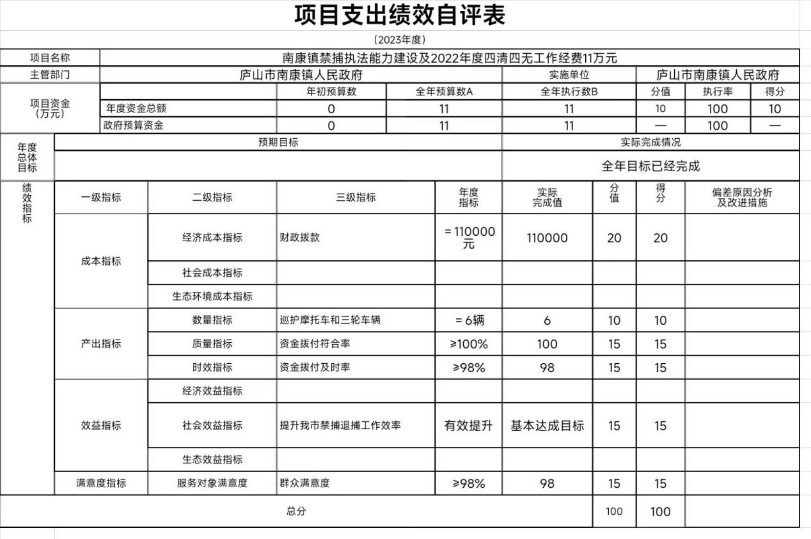 32-本部门“南康镇禁捕执法能力建设及2022年度四清四无工作经费资金”项目支出绩效自评结果如下: