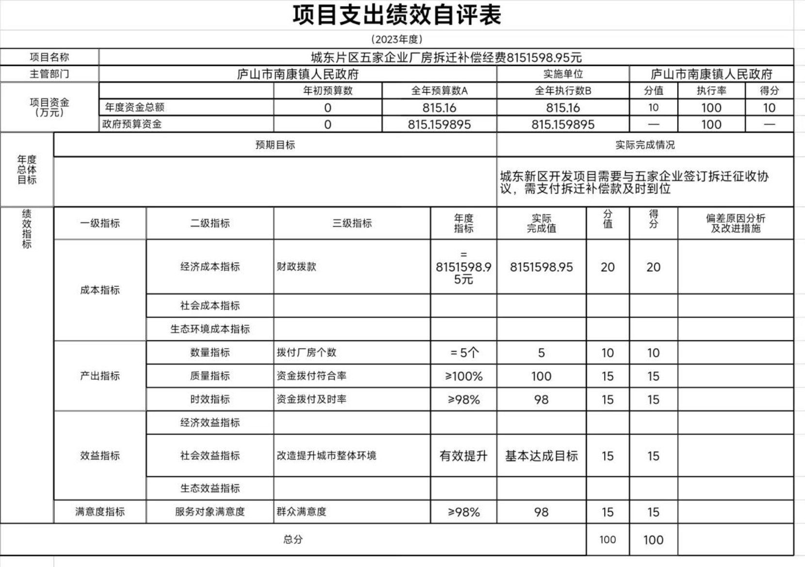 33-本部门“南康镇城东片区厂房拆迁补偿经费资金”项目支出绩效自评结果如下:
