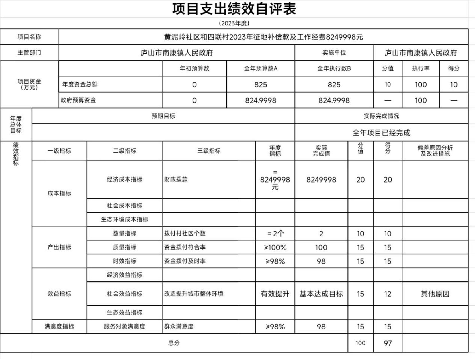35-本部门“南康镇黄泥岭社区和四联村2023年征地补偿款及工作经费资金”项目支出绩效自评结果如下: