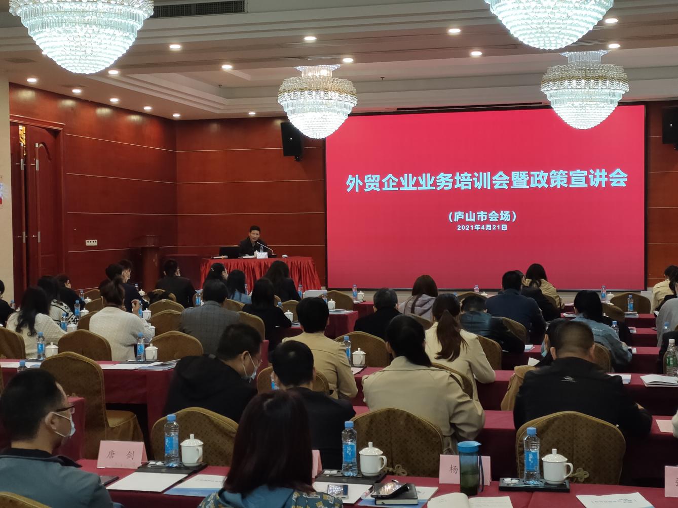 为扎实做好“六稳”工作,全面落实“六保”任务,帮助外贸企业进一步了解外贸政策及国际贸易便利化措施,助力企业积极应对新冠肺炎疫情带来的不利影响,促进企业在危机中寻觅新机,推动我市外贸高质量发展,4月21日,由庐山市商务局主办的外贸企业业务培训会暨政策宣讲会(庐山市会场)在庐山市温泉镇汤太宗召开。会议由九江市商务局调研员徐建红主持。九江市商务局、国家外汇管理九江市中心支局、九江海关、九江市税务局、九江市口岸发展服务中心、上港集团九江港务公司、中信保江西分公司、江西五湖祥和商务咨询有限公司,部分县(市、区)商务局领导及40余家外贸企业家代表参会。