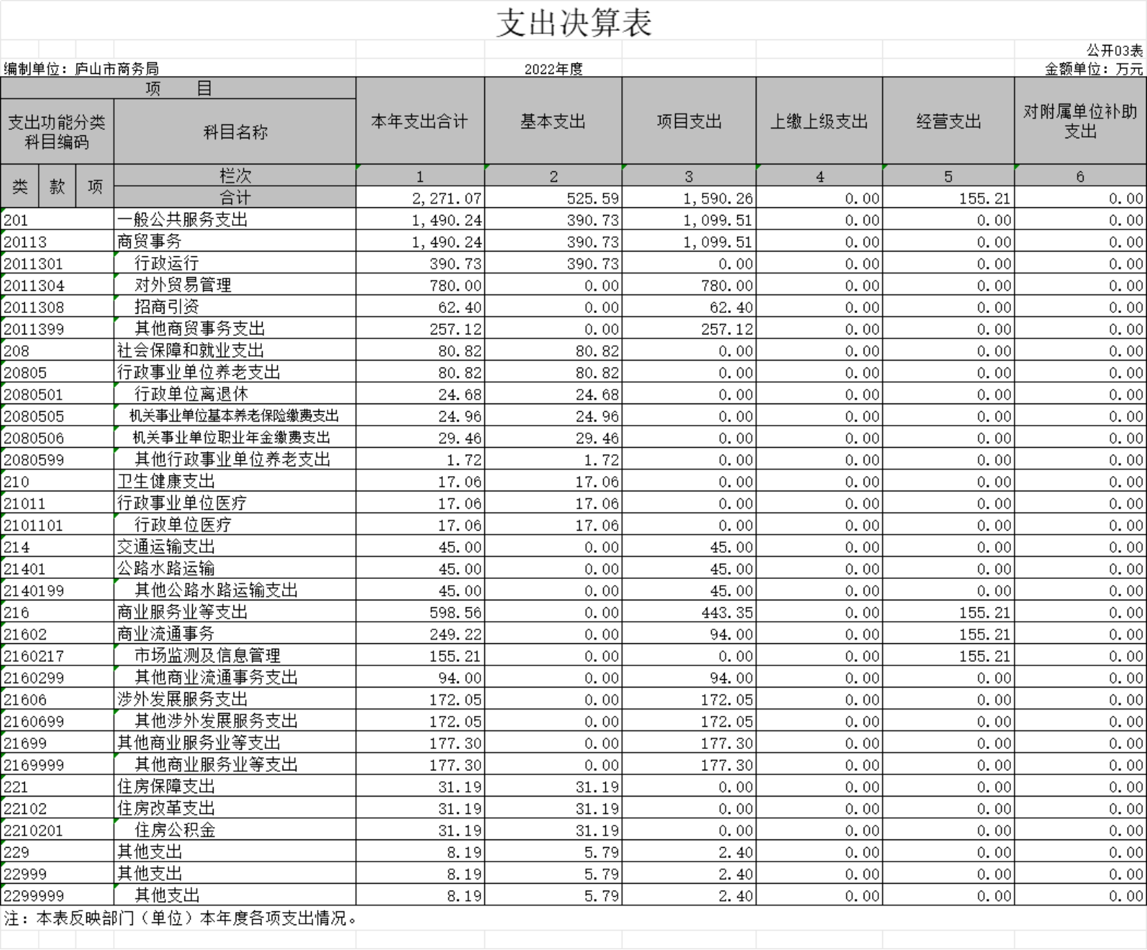 本单位2022年度支出总计 2271.07万元,其中本年支出合计2271.07万元,较2021年增加1592.55万元,增长234.7%,主要原因是:根据财政体制改革,以前年度经财政股室拨付至企业的资金,2022年经部门从预算管理一体化系统支出,下属自支自收事业单位市管中心首次纳入预决算;年末结转和结余0万元,较2021年增加0万元,增长0 %,主要原因是:自2020年起,财政统一收回存量资金,无结余结转资金。