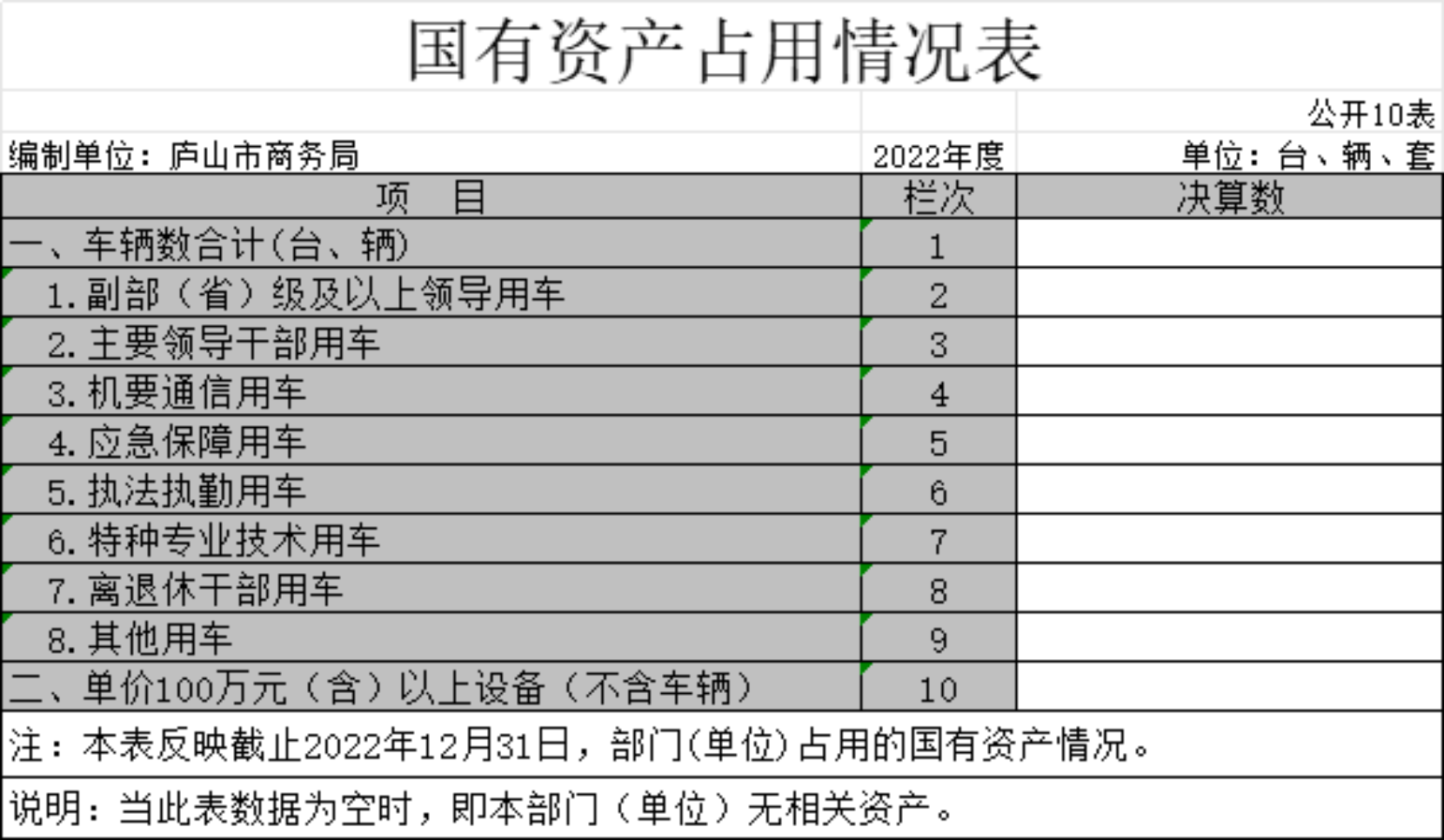 截止2022年12月31日,本部门国有资产占用情况见草案10表《国有资产占用情况表》。其中车辆中的其他用车无其他用车。