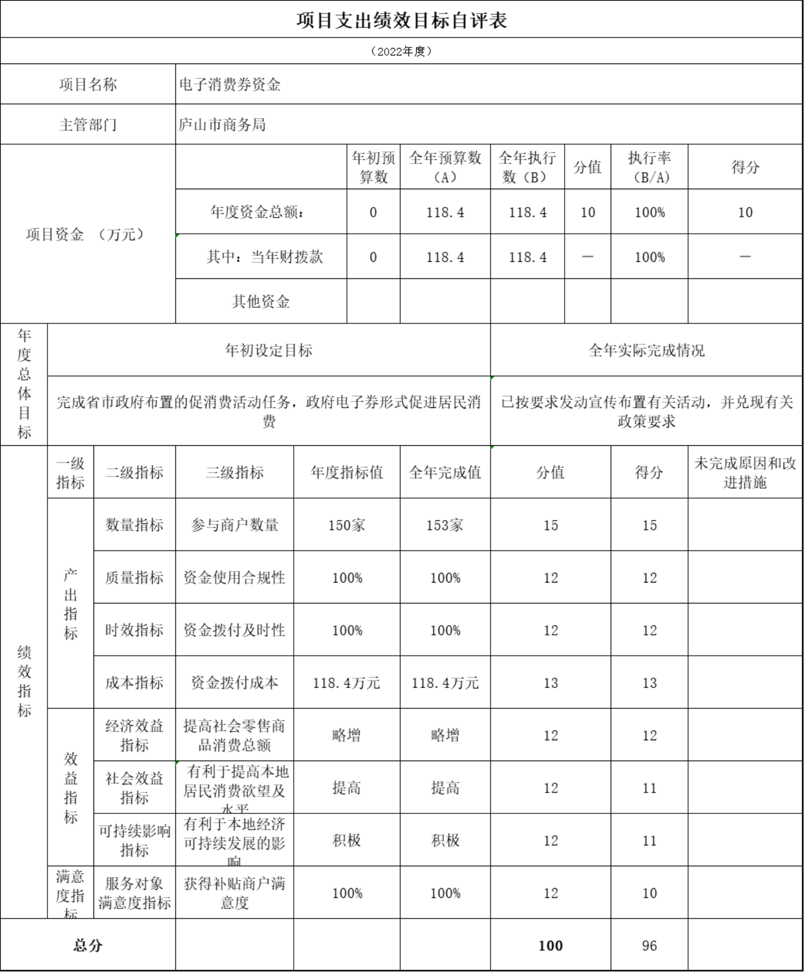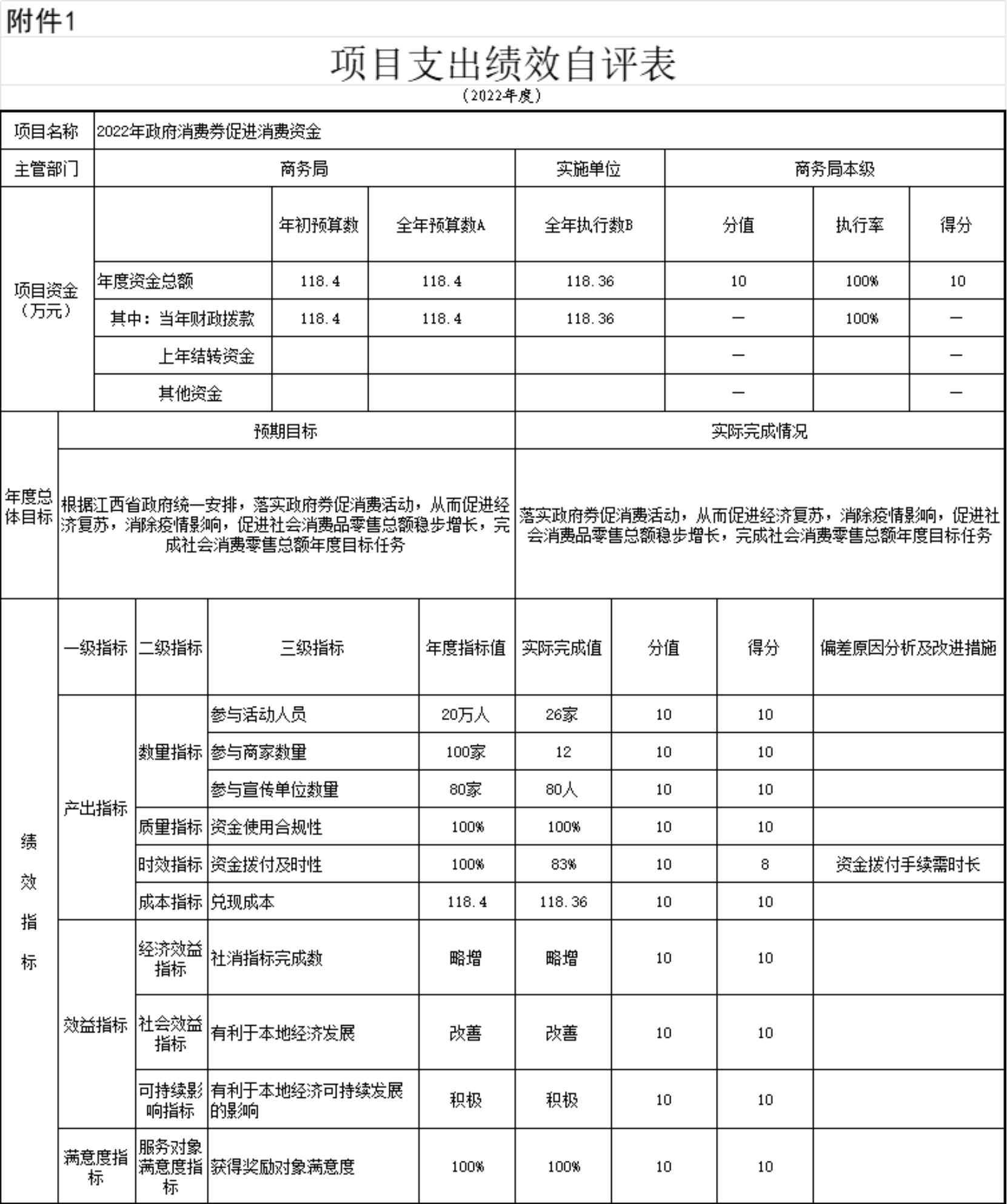 组织对“政府消费券促消费活动”等1个项目开展了部门评价,涉及一般公共预算支出118.4万元,政府性基金预算支出 0万元,国有资本预算支出0万元,从评价情况来看,通过对绩效指标进行自评打分,综合等级为优。