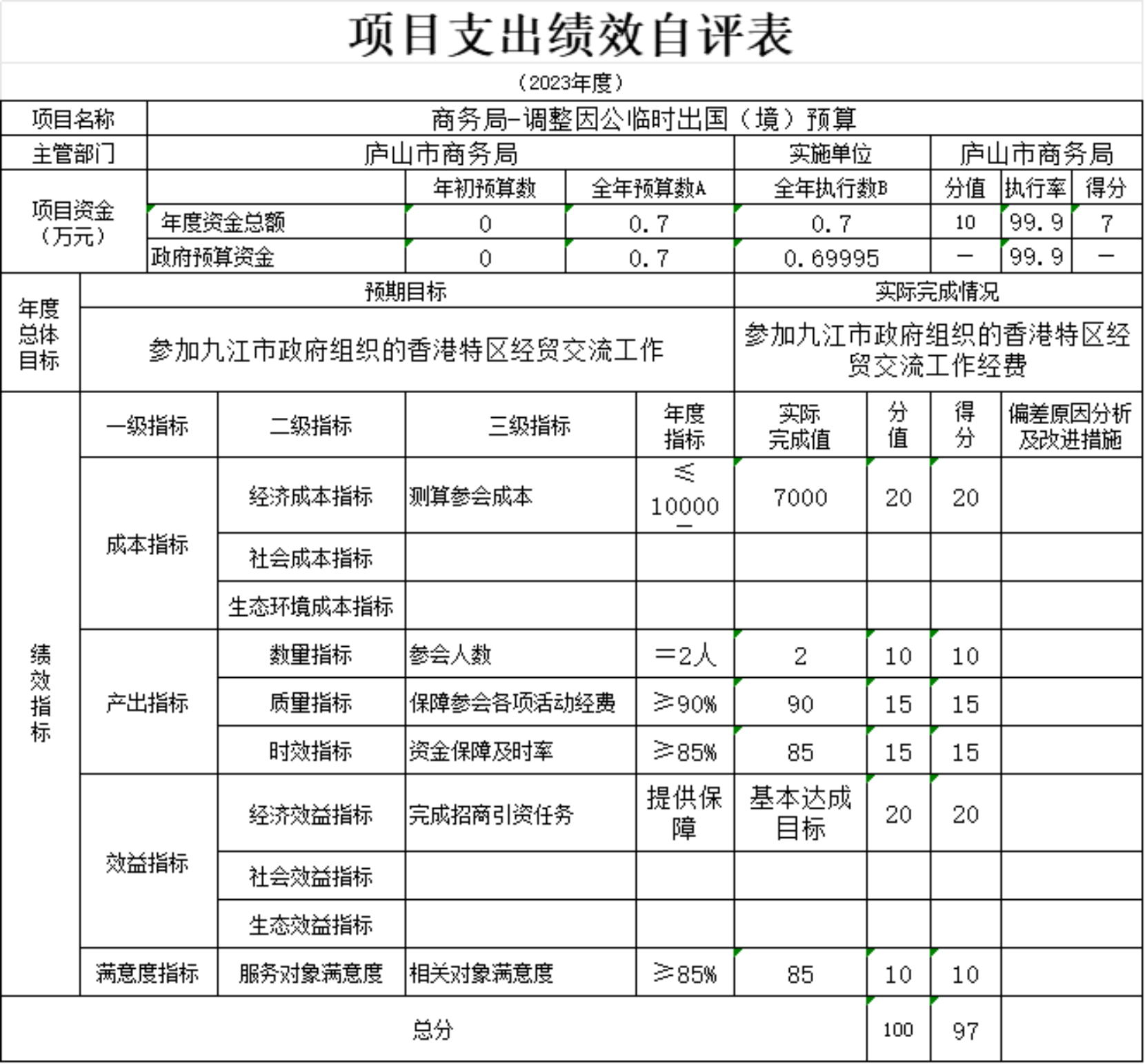 (一)因公出国(境)费全年预算数0.70万元,决算数0.52万元,完成全年预算的74.14%,主要原因:因公参加省政府举办的赣港经贸合作周,新增预算。决算数比上年增加0.52万元,主要原因:2022年没有出国(境)工作任务。全年安排因公出国(境)团组1个,累计2人次,主要是:赣港经贸合作周,庐山市批准参加人数2人。