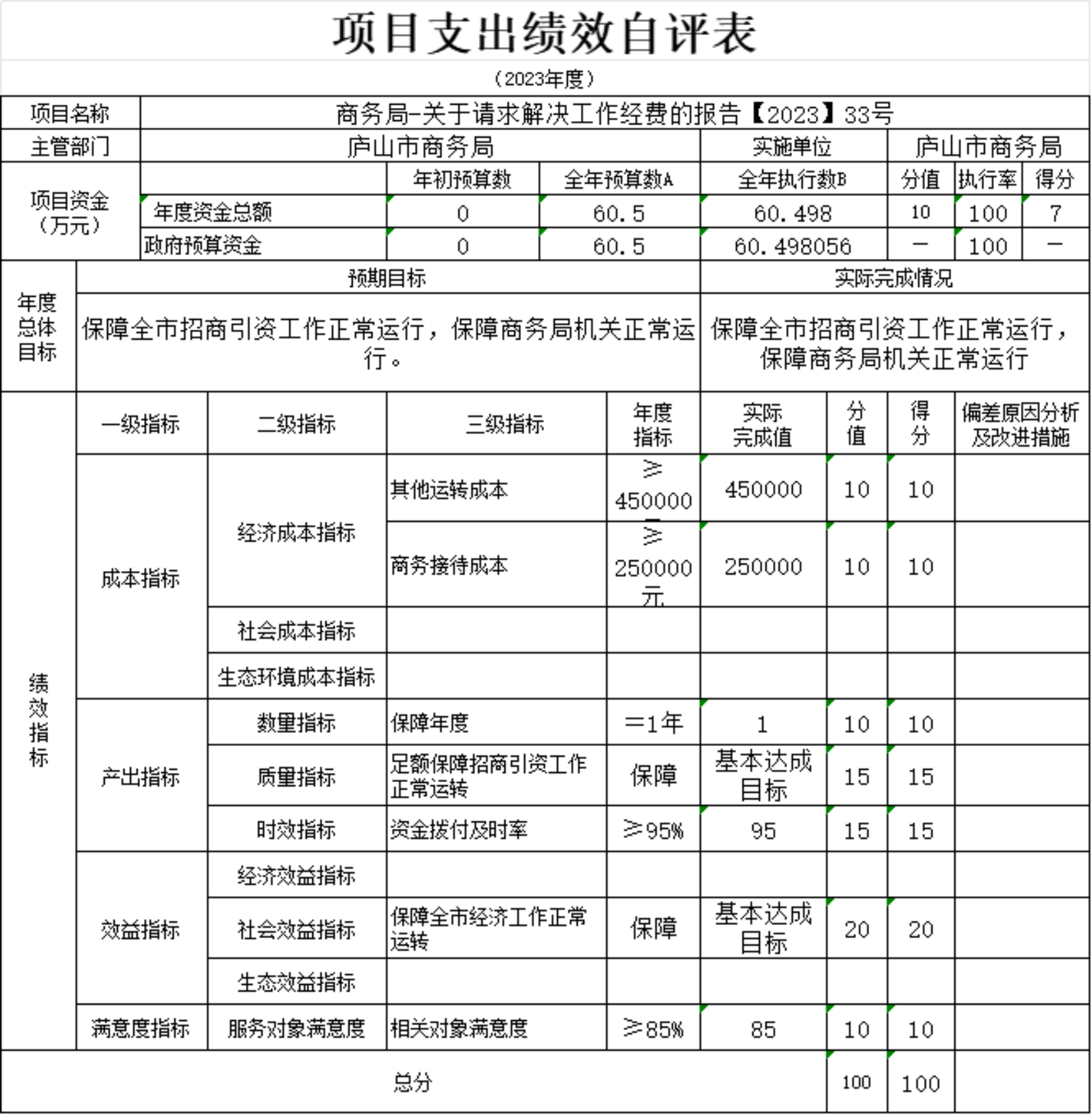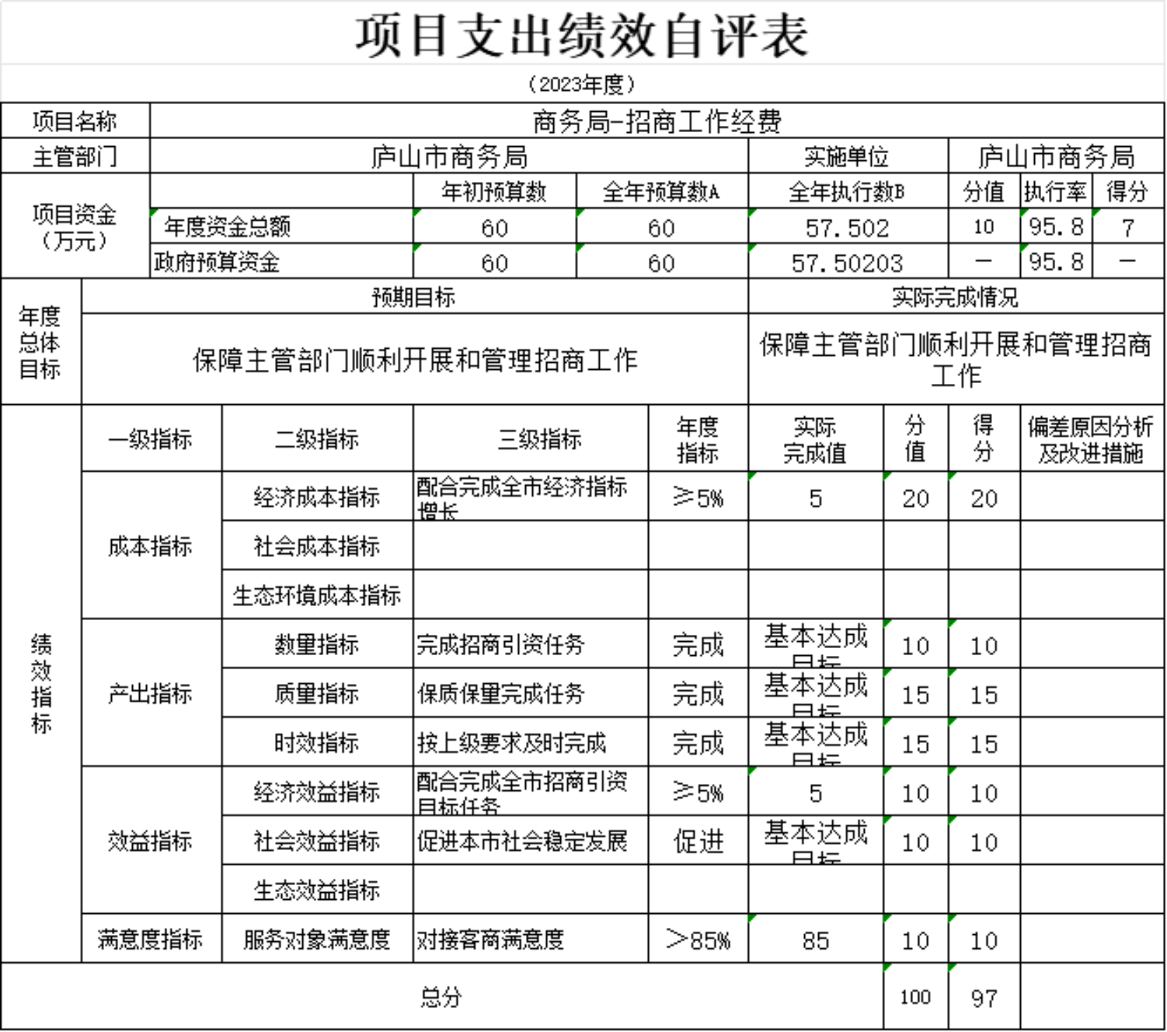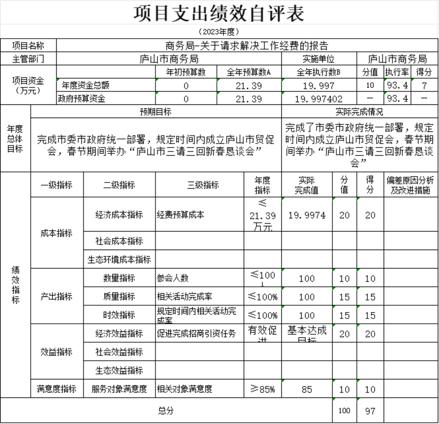 (三)公务接待费全年预算数63.50万元,决算数63.24万元,完成全年预算的99.59%,主要原因:根据全年招商工作需要确定的预算数以及按照预算数执行。决算数比上年增加18.66万元,增长41.86%,主要原因:商务局承接的商务接待较上年增长较大。全年国内公务接待1265批,累计接待1265人次,主要是:主要为:来庐山市考察、调研、检查等。