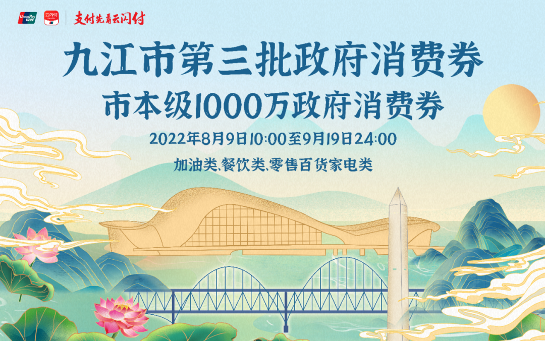 扫描下方二维码下载“云闪付”APP并完成用户注册→定位九江→首页点击“政府消费券”图标→选择消费券类型。 本次电子消费券使用规则将通过“九江市人民政府发布”“商务九江”微信公众号予以公告,请及时关注。 前往票券中所展示的指定商户出示“云闪付付款码”(限绑定62开头银联卡),再由商户使用扫码设备进行核销。