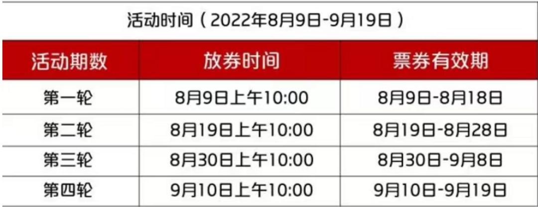 (3)消费券面额:加油券电子消费券设有满400元减100元加油优惠券20000张,满200元减50元加油优惠券30000张,满30元减10元加油优惠券50000张;餐饮电子消费券设有满600元减200元优惠券5000张,满300元减100元优惠券10000张,满150元减50元优惠券20000张;零售百货家电电子消费券设有满600元减200元5000张,满300元减100元10000张,满150元减50元20000张。消费者每轮可领取加油、餐饮、零售百货家电消费券各一张。
