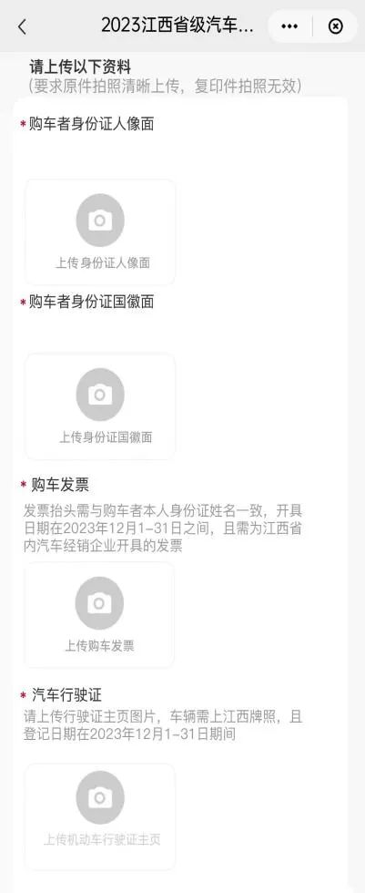 于2023年12月1日-31日期间(以购车发票时间为准),在江西省内的汽车经销企业购买7座(含)以下非营运燃油车新车或新能源新车,已取得购车发票(购车发票抬头需与本人身份证姓名一致)并上江西牌照的个人消费者均可申领汽车消费券。单位、企业等非个人用户购买汽车不享受补贴。