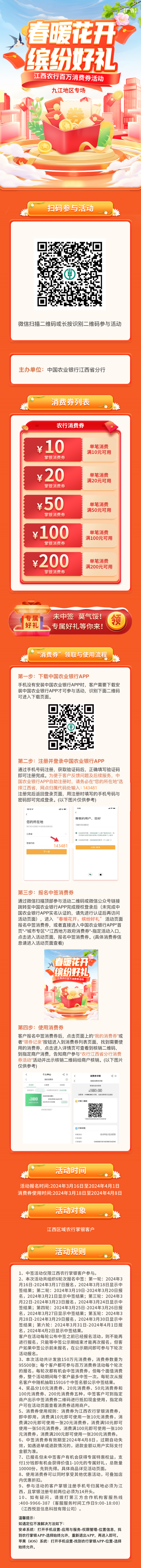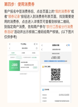 5、消费券使用规则:消费券为江西农行掌银消费券,即中即用,消费满10元即可使用一张10元消费券,消费满20元即可使用一张20元消费券,消费满50元即可使用一张50元消费券,消费满100元即可使用一张100元消费券,消费满200元即可使用一张200元消费券。