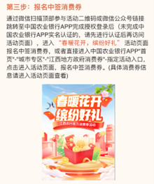 3、微信扫码活动二维码进入活动页面,或者直接进入农行掌银APP“首页”——“城市专区”——“江西地方政府消费券”——“春暖花开,缤纷好礼”,进入活动页面,先报名参与中签消费券活动。