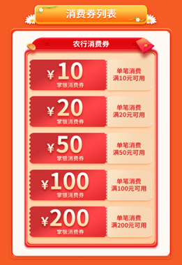 活动采用报名中签形式,消费者通过农行掌银APP报名,报名成功后,由系统随机抽取中签名单。每个消费者每个面值消费券可中签1次。本次中签面值消费券有10元消费券、20元消费券、50元消费券、100元消费券、200元消费券。