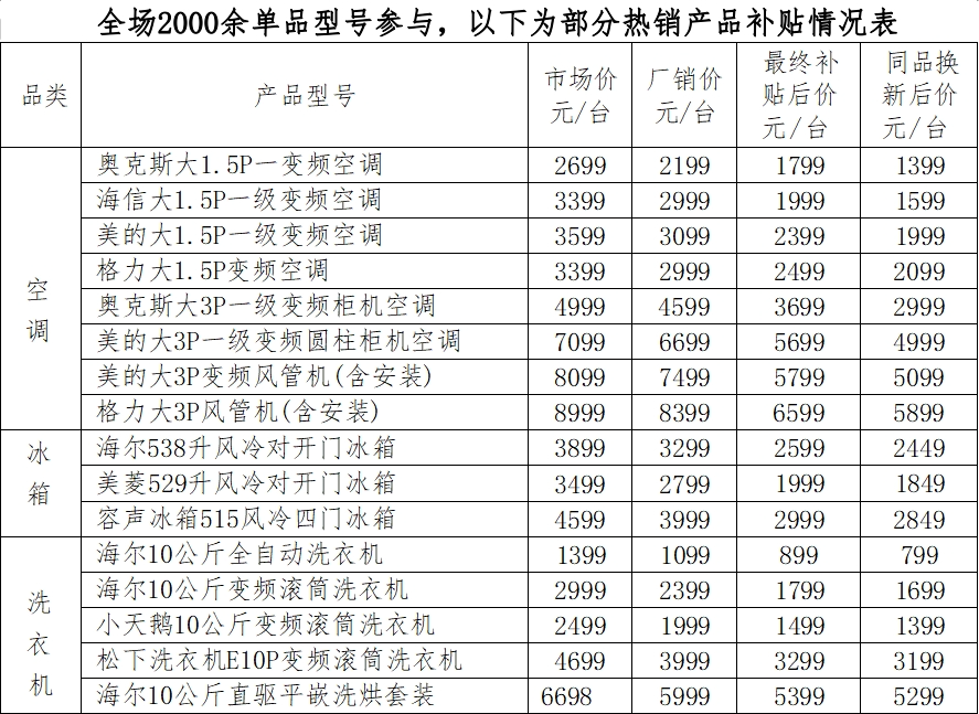 补贴涉及内容有空调、彩电、冰箱、洗衣机、厨房电器、小家电等,均按照厂销价每台至少补贴300元-3000元,套购多件产品至高补贴6000元不等,购买单品,价格在699元以上可以享受补贴优惠(补贴额度及补贴品类参见“部分热销产品补贴情况表”,其他补贴细则请至店内或电话问询)。