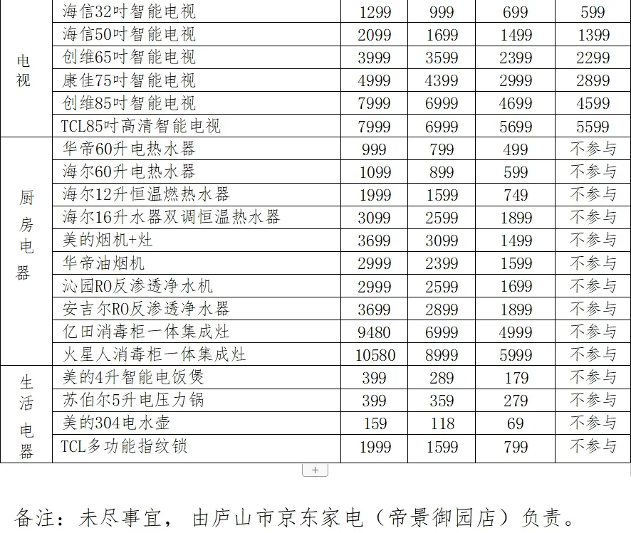 为深入贯彻落实《商务部等13部门〈关于促进绿色智能家电消费的若干措施的通知〉》及《商务部等14部门关于印发〈推动消费品以旧换新行动方案〉的通知》精神,紧抓国家鼓励推进消费品以旧换新决策机遇,补齐家电市场短板弱项,打通家电消费堵点,满足我市广大群众及工会会员家电更新换代需求。庐山市商务局、庐山市总工会联合庐山市京东家电开展“畅享生活·百万惠民”家电专项惠民补贴活动。