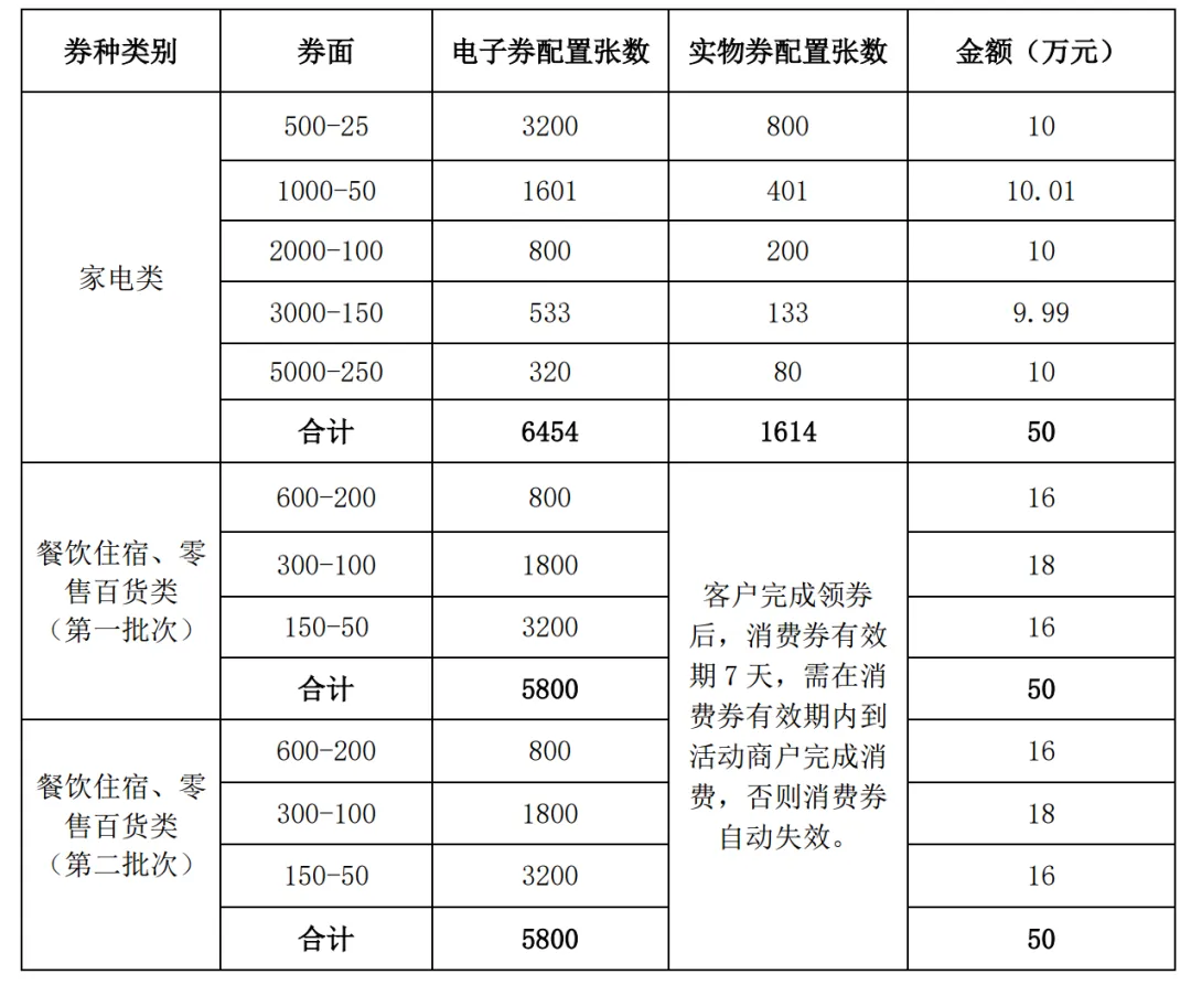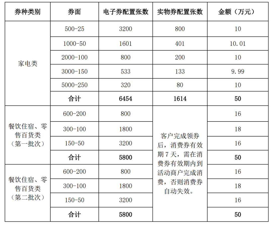 1、住宿餐饮券:限全市住宿、餐饮企业及个体工商户。设置满600元减200元、满300元减100元、满150元减50元住宿餐饮优惠券。拟安排财政资金50万元。