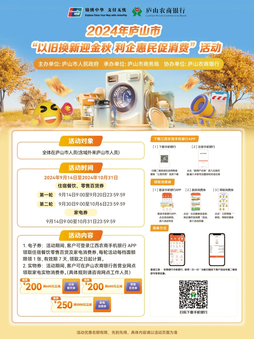 本次政府消费券发放活动,将通过“江西农商”APP及庐山农商银行任意网点现场发放两种方式,以发放住宿餐饮消费券、零售百货消费券、家电三种形式实施。采取个人申请、先到先得方式确定活动参与人员。