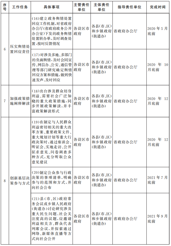 一、明确基本原则总体目标。坚持“标准引领、整体推进,需求导向、服务群众,依法依规、稳妥有序,改革创新、注重实效”的原则,紧密对接国家各部委制定的政务公开标准指引,全面推进我省基层政务公开标准化规范化工作,力争2020年初步建成政务公开事项标准目录体系和制度规范体系。到2021年底前,全省基层政务公开事项标准目录体系更加科学全面,公开平台更加丰富多元,公开工作机制更加规范高效,专业队伍更加健全完善。到2022年底前,基本建成全省统一、系统完备规范的基层政务公开标准体系,覆盖基层政府行政权力运行全过程和政务服务全流程,全面实现政务公开内容标准化、公开流程规范化、公开工作制度化、公开平台便捷化。