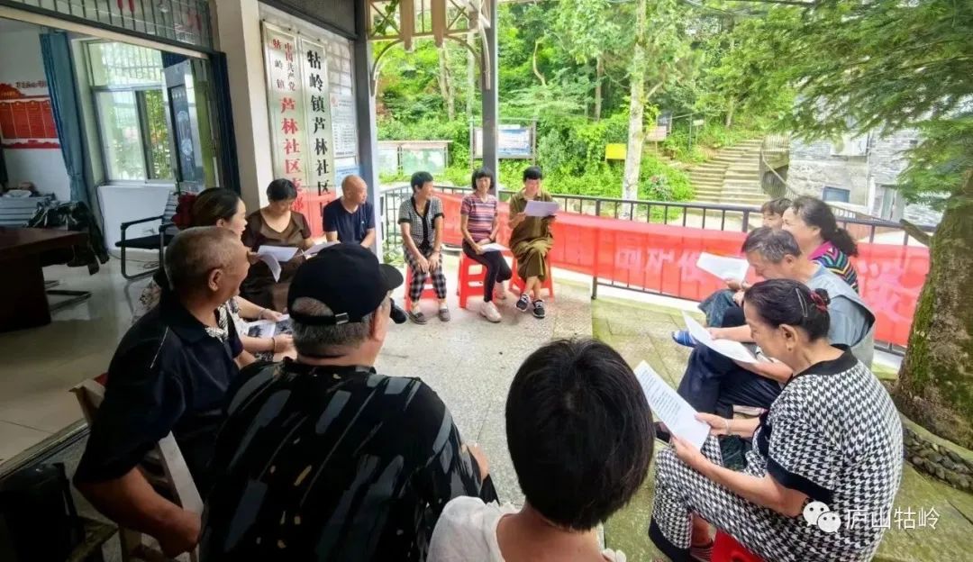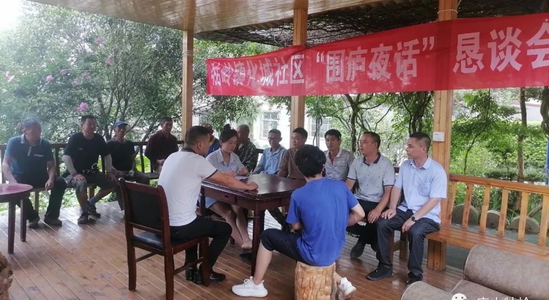 8月17日芦林社区党员代表、群众代表们在芦林社区办公室旁围坐一堂,召开“城乡人居环境整治”围庐夜话恳谈会。