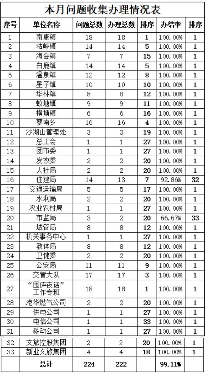 全市6月份“围庐夜话”共召开线下恳谈会94场。本月,共收集问题224个,分别为基础设施建设(19个)、人居环境整治(27个)、民生诉求(97个)、咨询建议(61个)、其他(20个),其中线下104个,线上120个。截至6月底,已办结问题222个,办结率为99.11%。其中,2个正在推进的问题分别为: