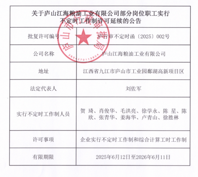 关于庐山江海粮油工业有限公司部分岗位职工实行不定时工作制许可延续的公告