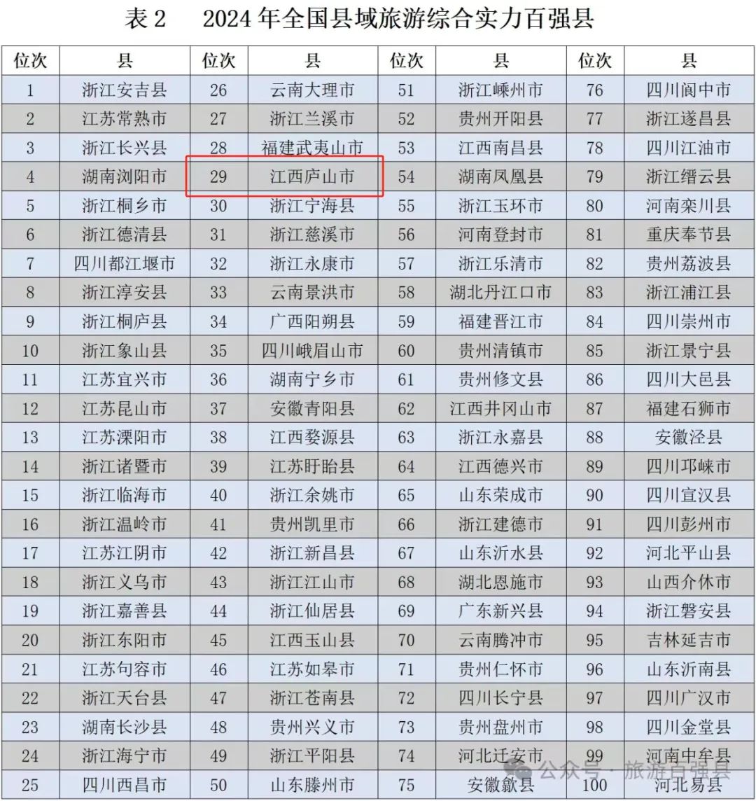 近日,在北京公布研究对象为大陆地区1866个的县(含县级市、自治县、旗、自治旗、特区、林区)揭晓了2024年全国县域旅游综合实力百强县2024年全国县域旅游发展潜力百佳县。其中,庐山市入选2024年全国县域旅游综合实力百强县位居江西省第一。