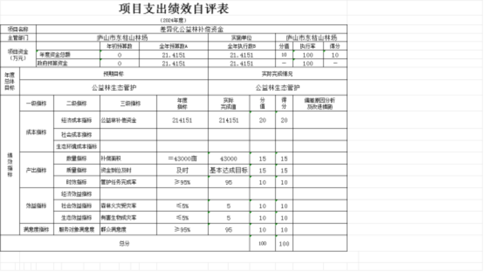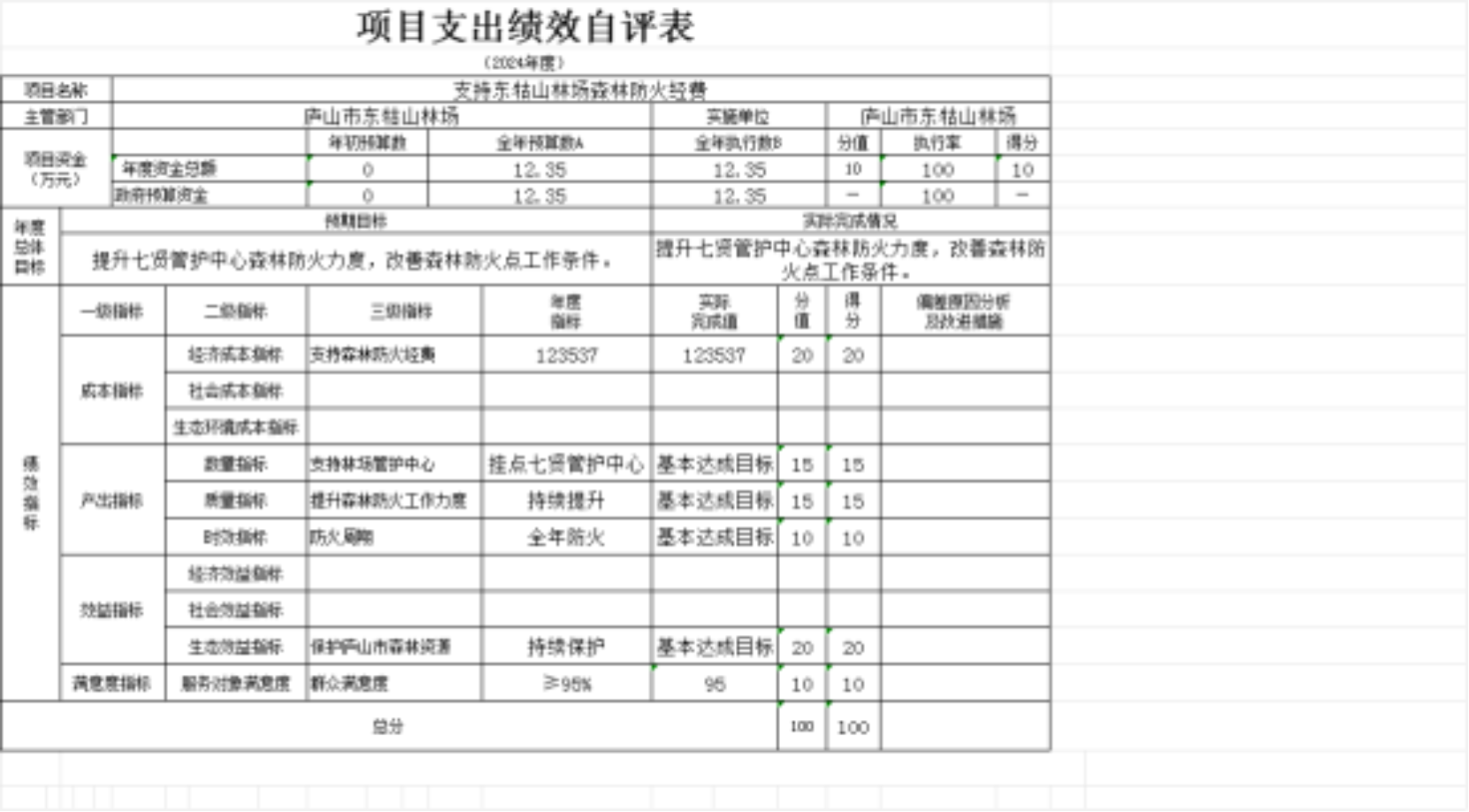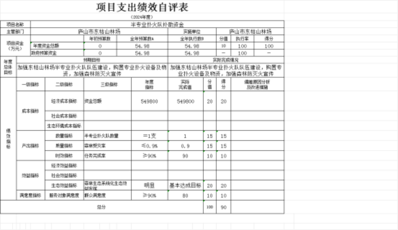 庐山市东牯山林场(本级)“ 半专业扑火队补助资金 ”,“ 国有生态公益林补偿资金 ”,“防火单位支持森林防火工作经费”,“国有农林场困难企事业补助”,“事业单位改革保基本运转费用”,“庐山峰植重点区域森林防火应急道路”,“松材线虫病除治”,“2023年差异化补偿公益林资金”,“2024年工信局支持东牯山林场森林防灭火工作经费” 等项目支出绩效自评结果如下: