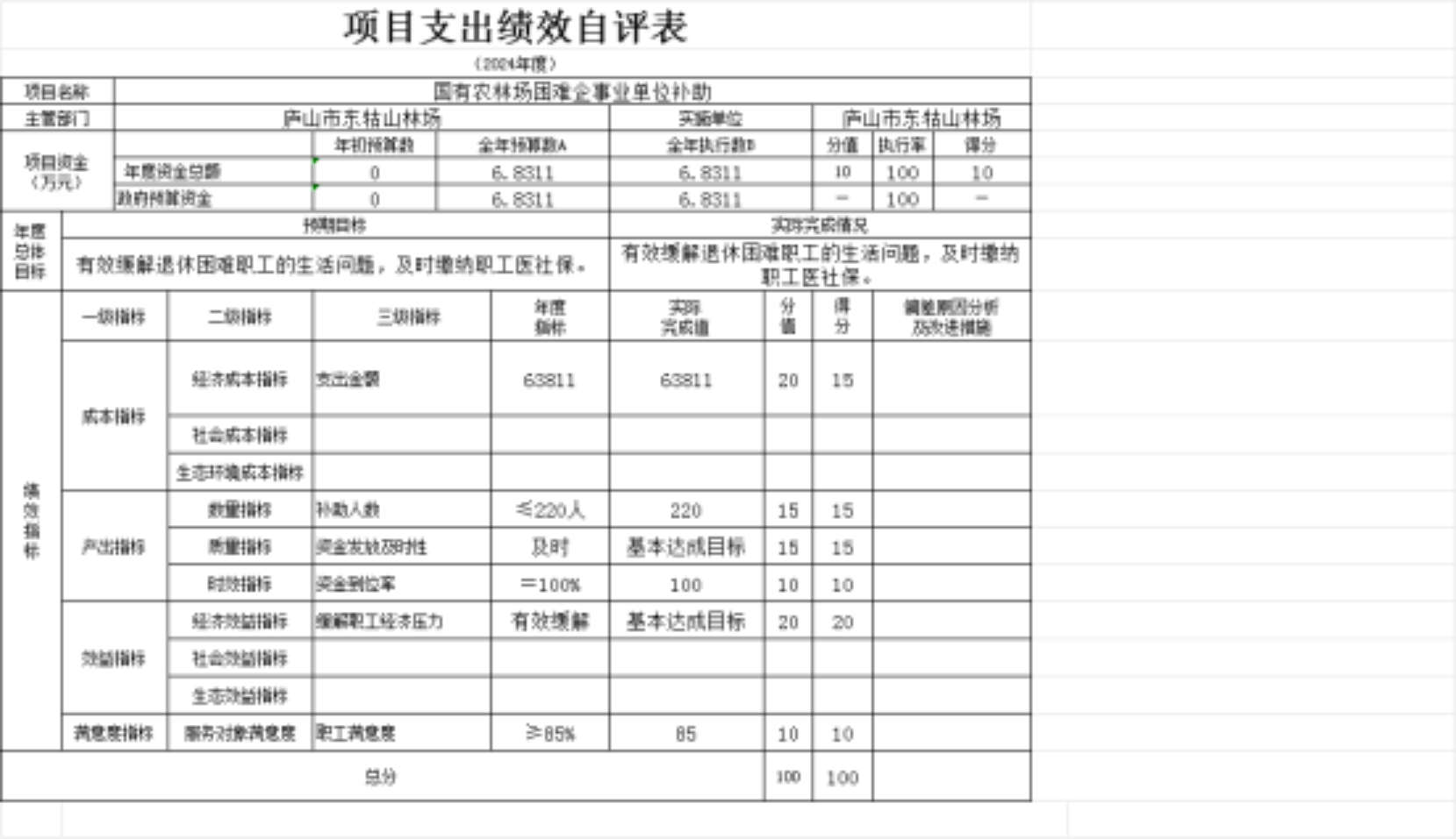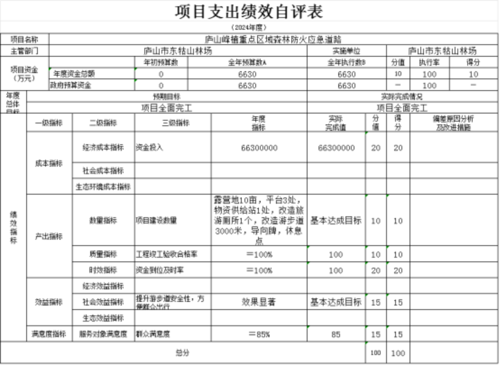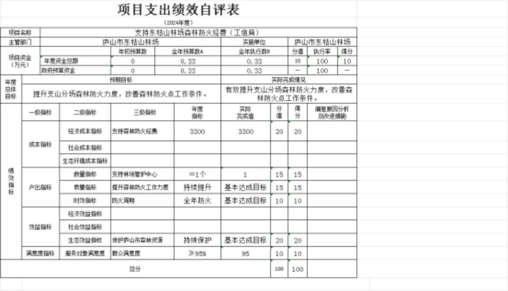 庐山市东牯山林场(本级)“ 半专业扑火队补助资金 ”,“ 国有生态公益林补偿资金 ”,“防火单位支持森林防火工作经费”,“国有农林场困难企事业补助”,“事业单位改革保基本运转费用”,“庐山峰植重点区域森林防火应急道路”,“松材线虫病除治”,“2023年差异化补偿公益林资金”,“2024年工信局支持东牯山林场森林防灭火工作经费” 等项目支出绩效自评结果如下: