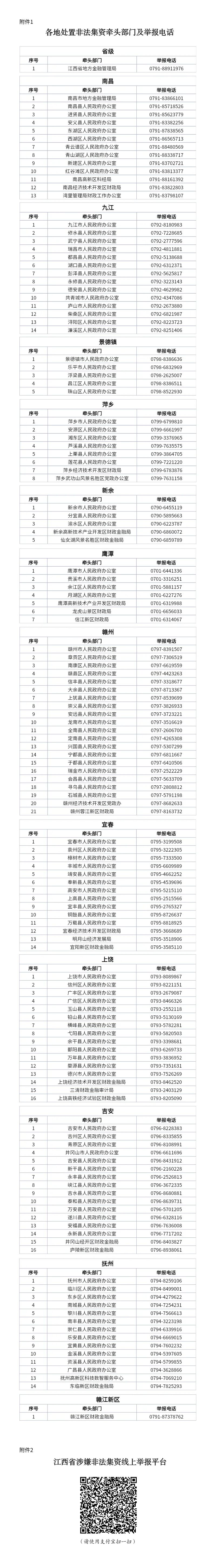 根据《防范和处置非法集资条例》等有关规定和机构改革要求,江西省省级处置非法集资牵头部门由原省地方金融监督管理局调整为省地方金融管理局。全省各设区市、赣江新区,各县(市、区)按照机构改革实际调整了处置非法集资牵头部门,现予以公告。如发现涉嫌非法集资行为,可通过全省统一的12345热线或支付宝“赣服通”非法金融活动随手拍举报,亦可直接向属地处置非法集资牵头部门举报。