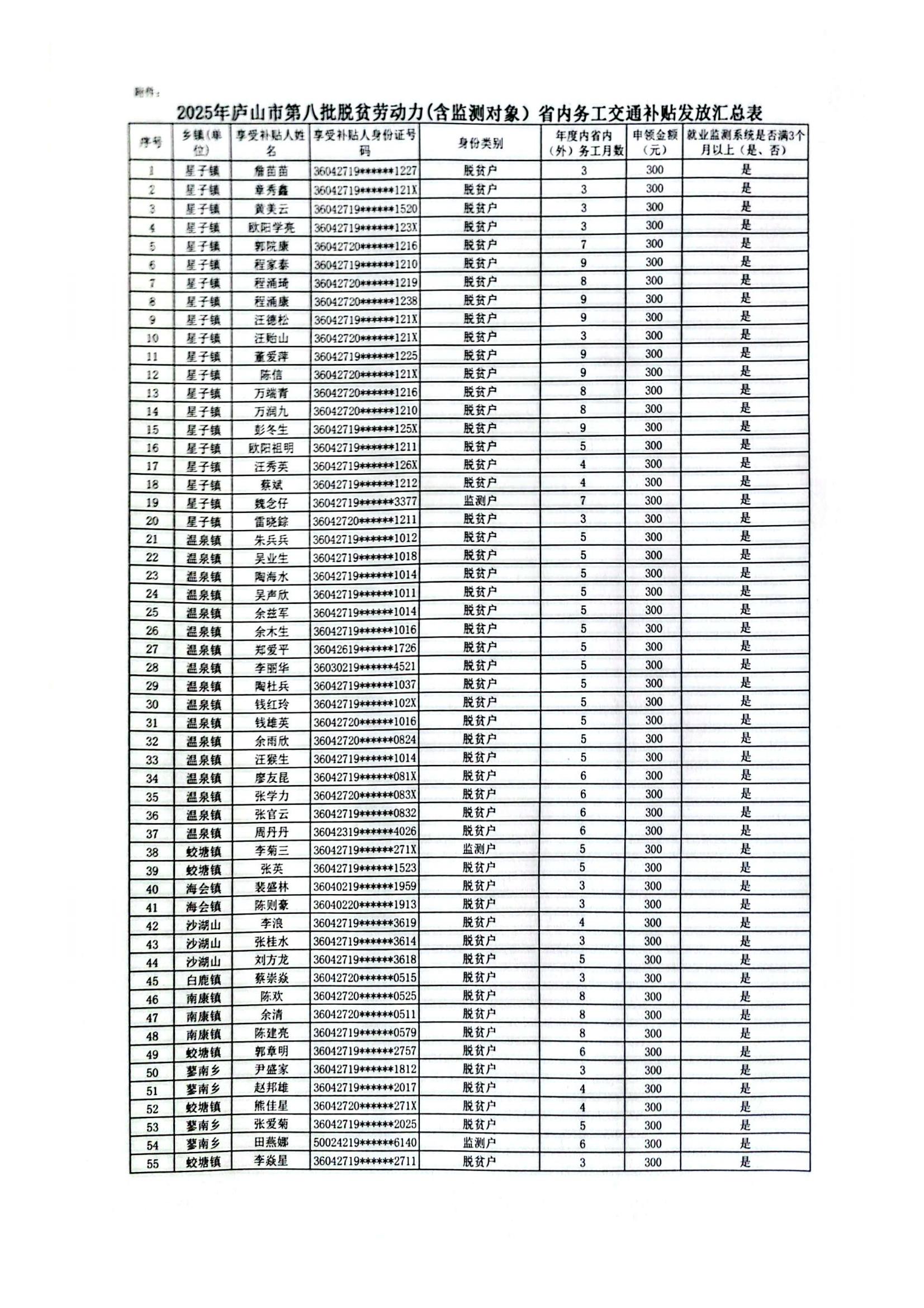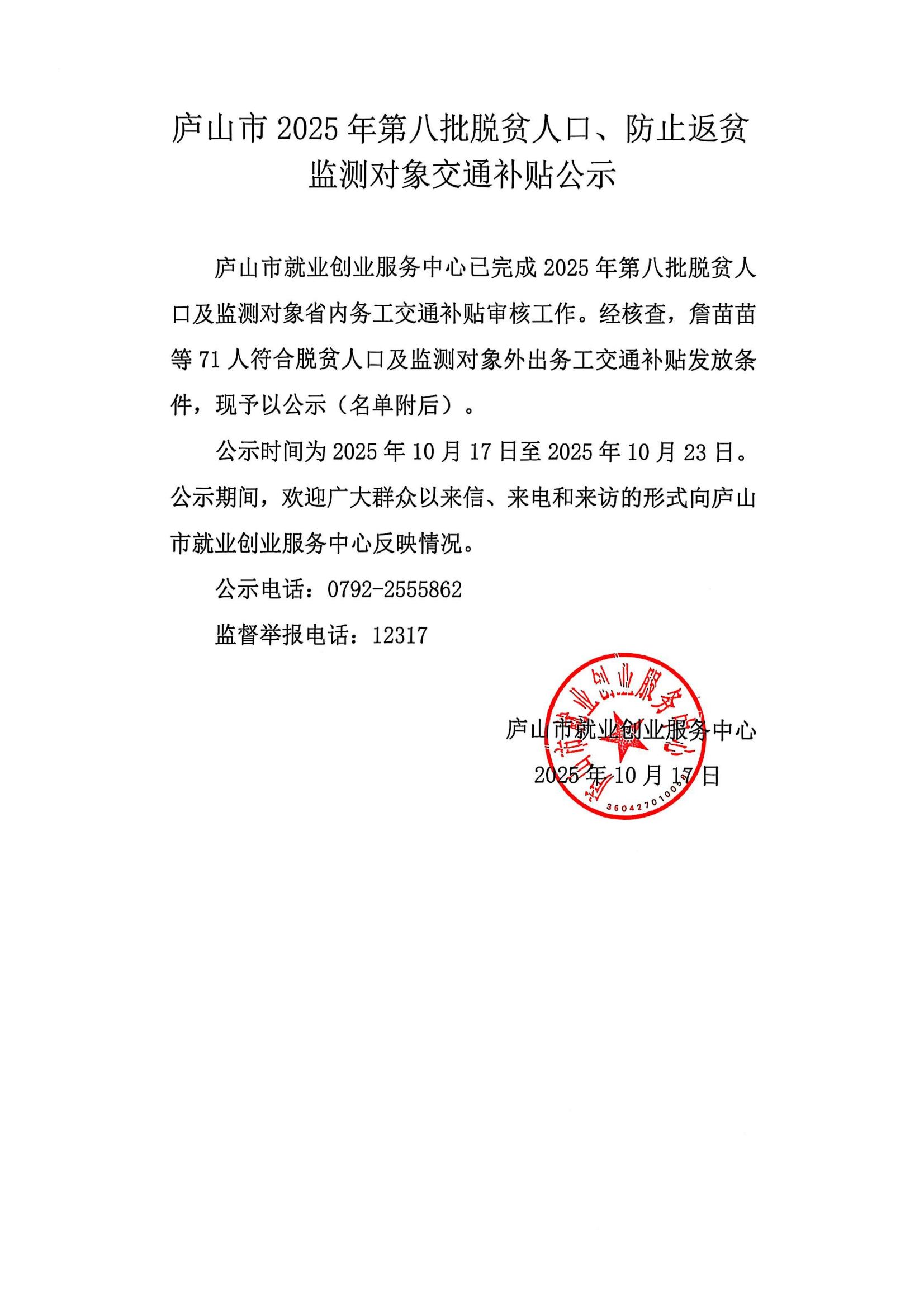 庐山市 2025年第八批脱贫人口、防止返贫监测对象交通补贴公示