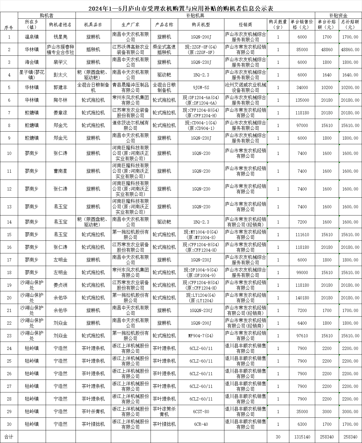 2024年1—5月庐山市受理农机购置与应用补贴的购机者信息公示表