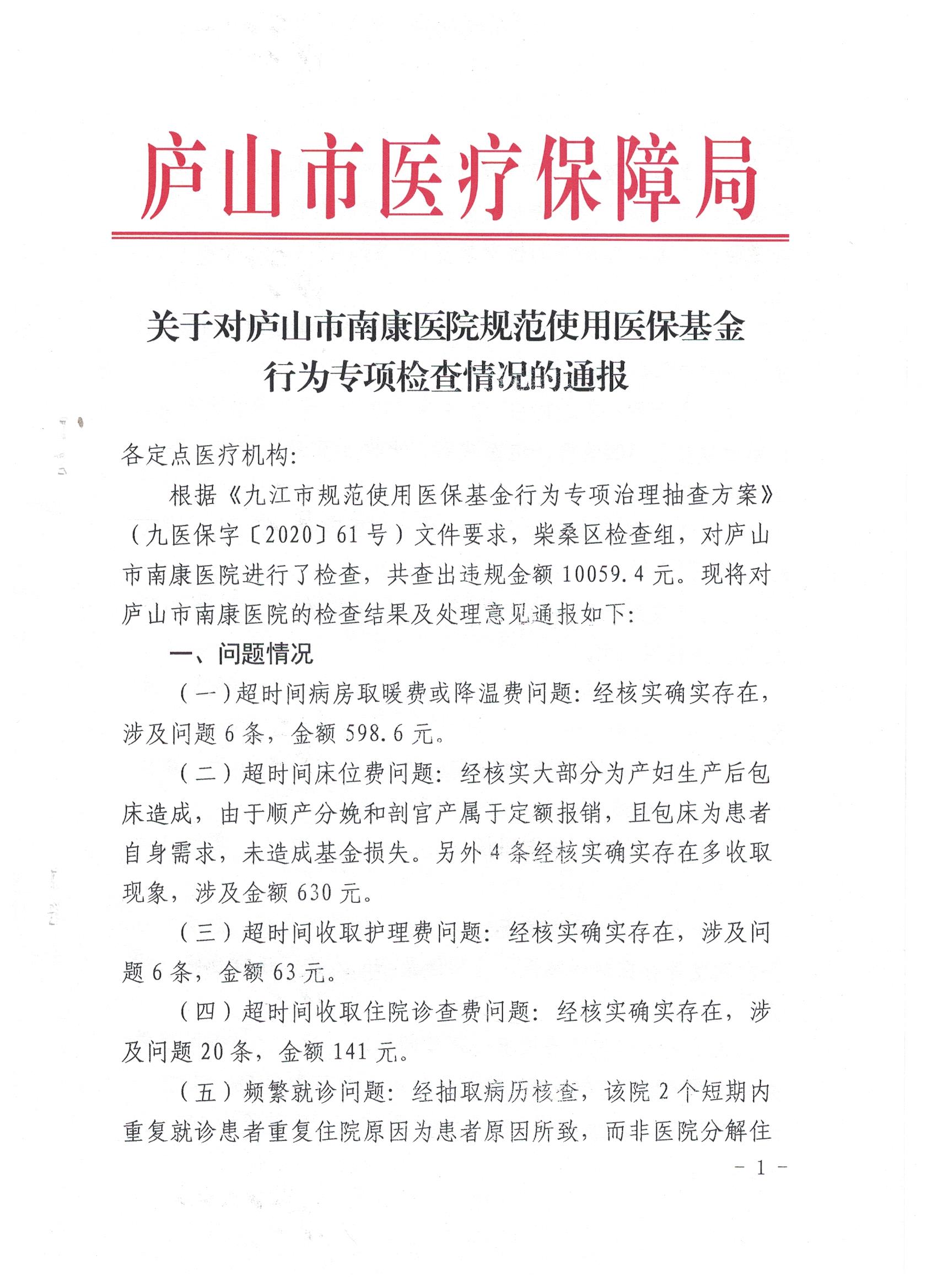 关于对庐山市南康医院规范使用医保基金行为专项检查情况的通报