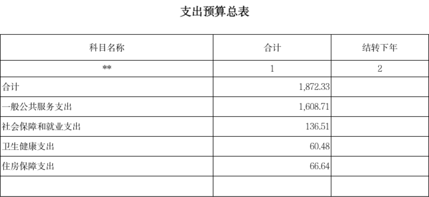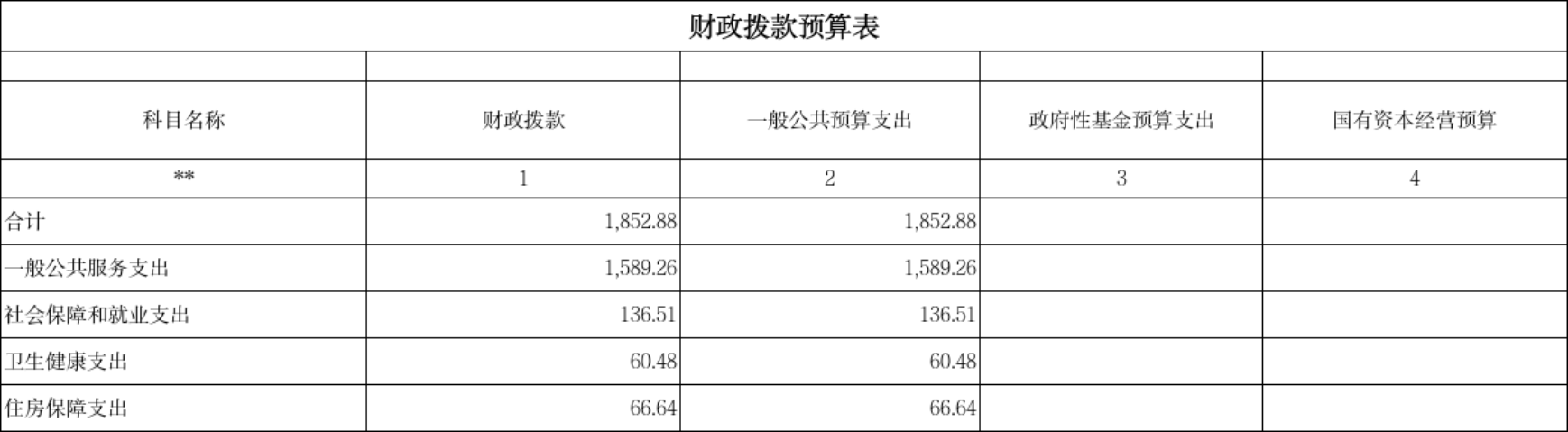 按支出功能科目划分:一般公共服务支出1589.62万元,较上年预算安排增加662.51万元;社会保障和就业支出136.51万元,较上年预算安排增加76.57万元;卫生健康支出60.48万元,较上年预算安排增加37.6万元;住房保障支出66.64万元,较上年预算安排增加32.7万元。