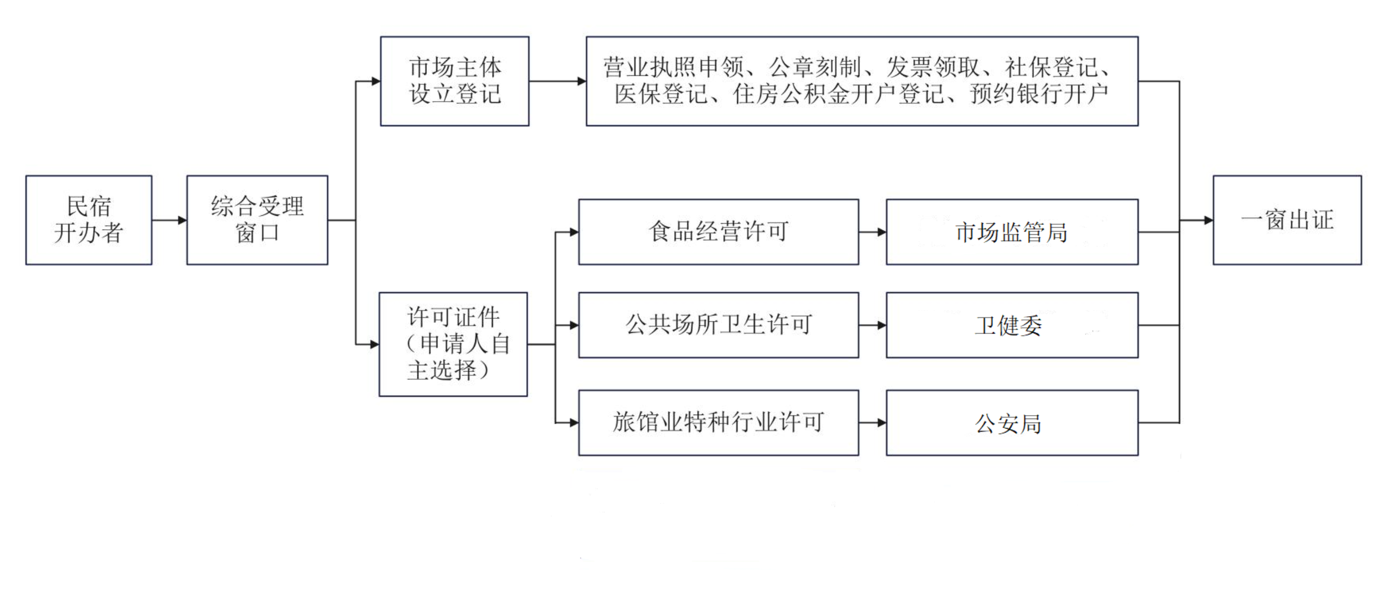 本方案所指的“民宿一件事”是指民宿申请人自愿选择全流程一事通办所涉及的市场主体准入审批事项,主要包括公司设立登记、公共场所卫生许可、食品经营许可、旅馆业特种行业许可等行政许可事项的行为。