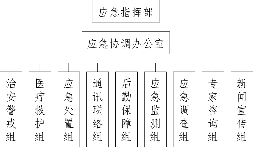 根据突发事件应急响应与处置工作需要,共设立9个应急响应小组,分别为治安警戒组、医疗救护组、应急处置组、通讯联络组、后勤保障组、应急监测组、应急调查组、专家咨询组、新闻宣传组。