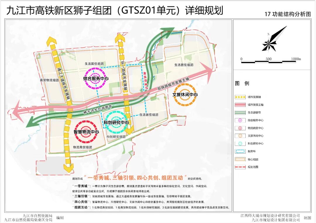 规划区建设为集物流仓储、现代商贸、科研创新、高端康养、居住休闲等功能多元复合的新城空间,充分展示九江智慧物流科创中心、柴桑品质生活康养新城的定位。四、空间结构
