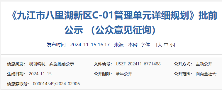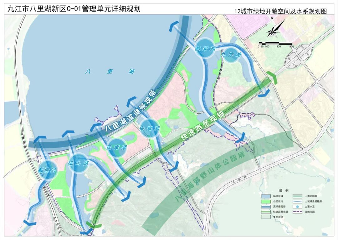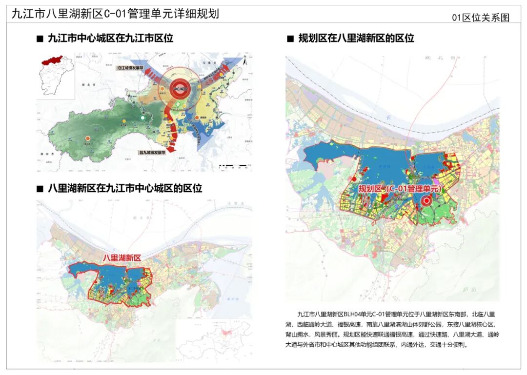 为进一步完善“五级三类”国土空间规划体系,有效传导落实国土空间总体规划,科学指导八里湖新区的规划建设,根据《中华人民共和国城乡规划法》及《自然资源部关于加强国土空间详细规划工作的通知》(自然资发2023 43号)的要求,统筹安排规划区内土地使用和各项建设,优化规划区内各地块开发强度等控制指标体系,落实道路和工程管线控制性位置以及空间环境控制要求,为八里湖新区建设管理提供法定依据,特编制《九江市八里湖新区C-01管理单元详细规划》。二、规划范围