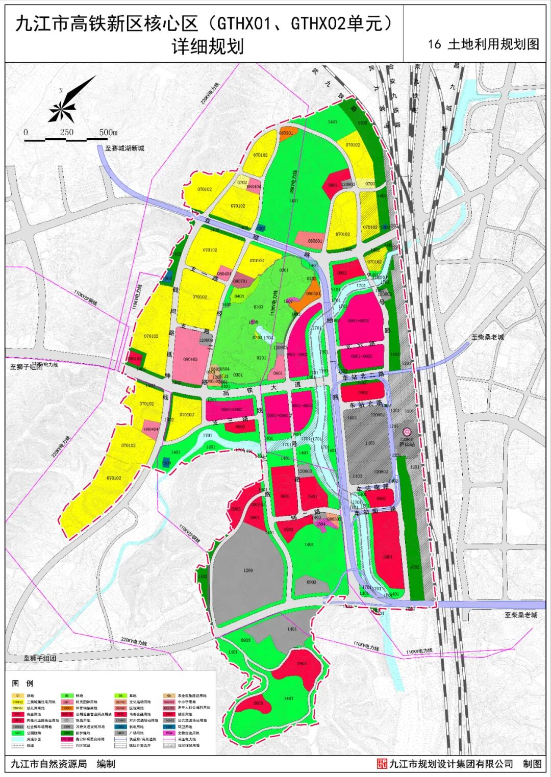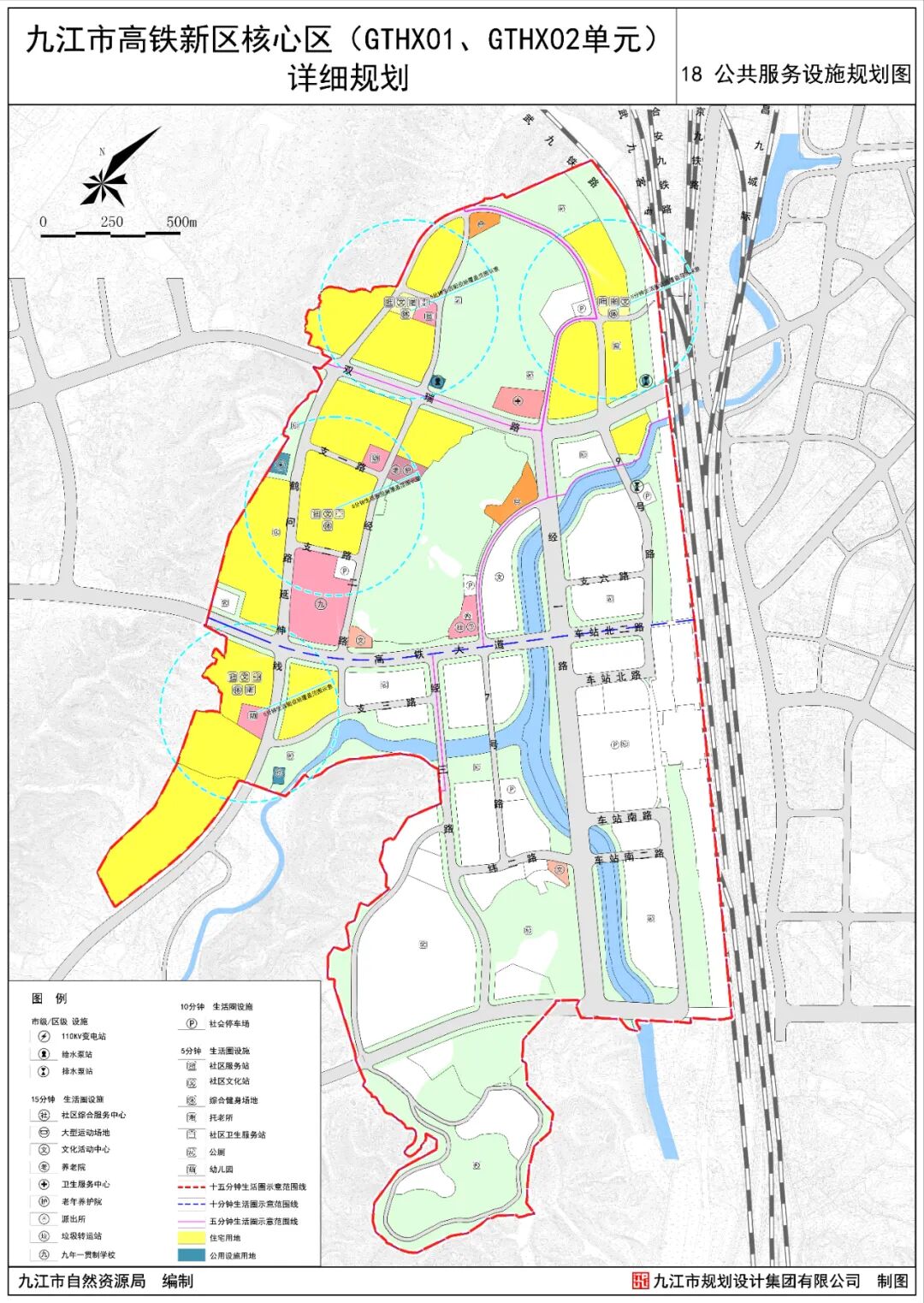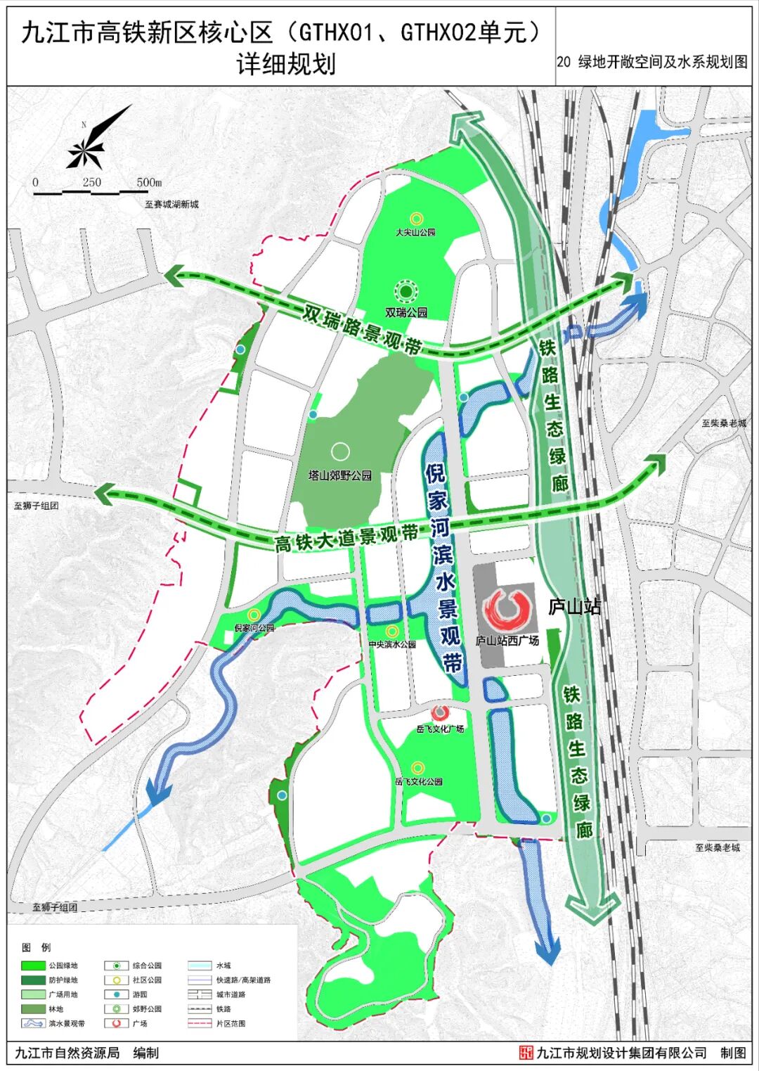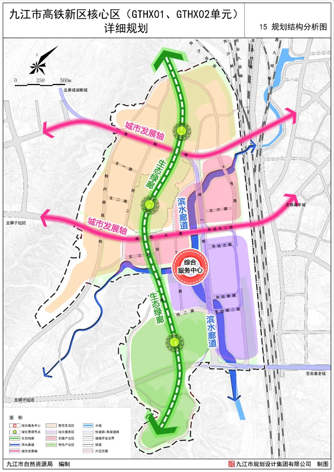 为贯彻落实《九江市国土空间总体规划(2021-2035年)》、《柴桑区国土空间总体规划(2021-2035年)》等上位规划,立足城市建设发展,改善城市面貌,强化规划调控作用,整合城市用地,优化城市结构,满足规划管理需求,更好指导九江市高铁新区核心区的建设,特制定本详细规划。本次规划范围西起规划的鹤问路延伸线,东至铁路,北起自然山体,南至原九江市垃圾填埋场,规划区总用地面积约459.94公顷,其中城镇开发边界面积约421.18公顷。规划将本区打造成为绿色、创新、高效、便捷的高铁新区门户,建成集交通枢纽、商务商业、文化会展、新兴产业、和谐居住等功能为一体的核心区,展现城市形象和特色,成为带动高铁新区发展的引擎。两轴:双瑞路和高铁大道构成的两条城市发展轴,串联柴桑老城区、高铁核心区、狮子组团;两廊:沿倪家河形成滨水廊道,由北至南串联大尖山、塔山、马鞍山等山体,构成生态绿廊;四区:西北部居住生活区、东南部综合服务区、中部创意产业区、南部特色产业区。规划区总用地面积459.94公顷,其中城镇开发边界面积421.18公顷。城镇开发边界内城镇建设用地面积为409.80公顷,非建设用地面积为11.38公顷,为倪家河水域。居住用地:面积78.02公顷,占城镇开发边界面积的18.52%。其中城镇住宅用地面积76.74公顷,城镇社区服务设施用地面积1.29公顷。公共管理与公共服务用地:面积15.08公顷,占城镇开发边界规模的3.58%。其中机关团体用地面积1.11公顷,文化用地面积0.95公顷,教育用地面积8.25公顷,体育用地面积2.30公顷,医疗卫生用地面积1.56公顷,社会福利用地面积0.92公顷。商业服务业用地:面积58.35公顷,占城镇开发边界面积的13.85%。其中商业用地面积41.36公顷,商务金融用地面积6.07公顷,娱乐用地面积10.92公顷。交通运输用地:面积106.59公顷,占城镇开发边界面积的25.31%。其中铁路用地面积17.94公顷,城镇村道路用地面积51.72公顷,公共交通场站用地面积7.05公顷,社会停车场用地总面积2.20公顷,其他交通设施用地面积27.69公顷。公用设施用地:面积0.92公顷,占城镇开发边界面积的0.22%。其中给水用地面积0.20公顷,排水用地面积0.09公顷,供电用地面积0.39公顷,环卫用地面积0.24公顷。绿地与开敞空间用地:面积126.77公顷,占城镇开发边界面积的30.10%。其中公园绿地面积90.87公顷,防护绿地面积27.49公顷,广场用地面积8.41公顷。混合用地:规划布局商业+科研混合用地(0901+0803)面积23.45公顷。其他非建设用地:规划区非建设用地面积48.49公顷,其中城镇开发边界外37.12公顷,城镇开发边界内11.37公顷(陆地水域)。快速路红线宽度40米,双向4车道,规划向西连接至赛城湖新区,向东连接柴桑老城区。双瑞路红线宽度47.50-57.50米,在规划区内部分道路与快速路并线,道路形式为地面和高架两层形式。高铁大道红线宽度50米,主要连接高铁新区与狮子组团。规划形成“三横、两纵”的骨架路网体系,城市道路网密度为6.17公里/平方公里。其中三横为双瑞路、高铁大道、南外环线,两纵为经一路(高架快速路)、鹤问路延伸线。规划区内道路形成城市快速路-主干路-次干路-支路四级道路系统。其中快速路为高架快速路,为双向4车道;主干路是连接各片区的主要道路,贯穿全区或组团之间,道路红线宽度为45-67米;次干路是连接主干路和支路之间的道路,主要为组团内交通服务,道路红线宽度为30-52.5米;支路道路红线宽度为14-24米。保留公交场站和长途汽车站各1处;规划5处社会停车场用地,用地面积2.20公顷。规划新建1处高铁新区综合服务中心,位于高铁大道与7号路交叉口西北侧,用地面积1.11公顷。居住区级文体设施:规划设置2处文化活动用地,分别位于中部山体南侧和岳母祠东侧;设置2处独立占地体育活动用地,分别位于7号路以西和双瑞公园以北。社区级文体设施:结合住宅区或公共建筑配置社区级综合文化设施,开展书报阅览、书画、文娱、健身、音乐欣赏、茶座等服务;结合社区服务中心或公共绿地设置室外健身场地(含老年户外活动场地)、小型多功能运动(球类)场地。规划布置1所九年一贯制学校,位于高铁大道以北、鹤问路延伸线以东,用地面积6.06公顷。规划布置4所幼儿园,分别位于沙河街道西出口安置房,双瑞路与支六路交叉口西北侧,支一路与经二路交叉口西北侧,高铁大道与鹤问湖延伸线交叉口西南侧。建立片区级医院和社区卫生服务站两级配置医疗卫生服务体系。片区级医院:规划新增1处高铁新区医院,位于双瑞路与经一路交叉口西北侧,用地面积1.56公顷。社区卫生服务站:社区卫生服务站结合居住用地或商业用地布置。居住区级社会福利设施:规划设置居住区级社会福利设施1处,位于经二路与双瑞路交叉口东南侧,用地面积0.92公顷。社区级养老设施:结合社区服务中心或居住用地复合建设。