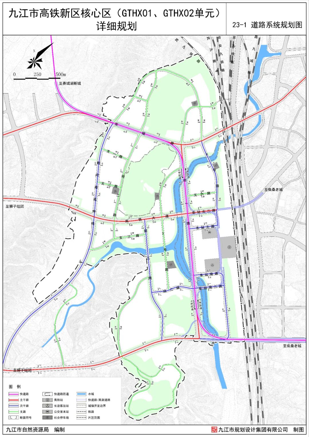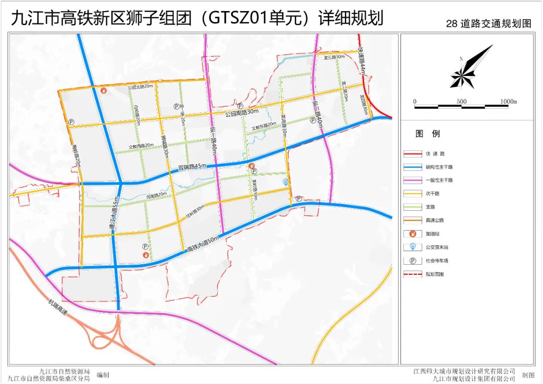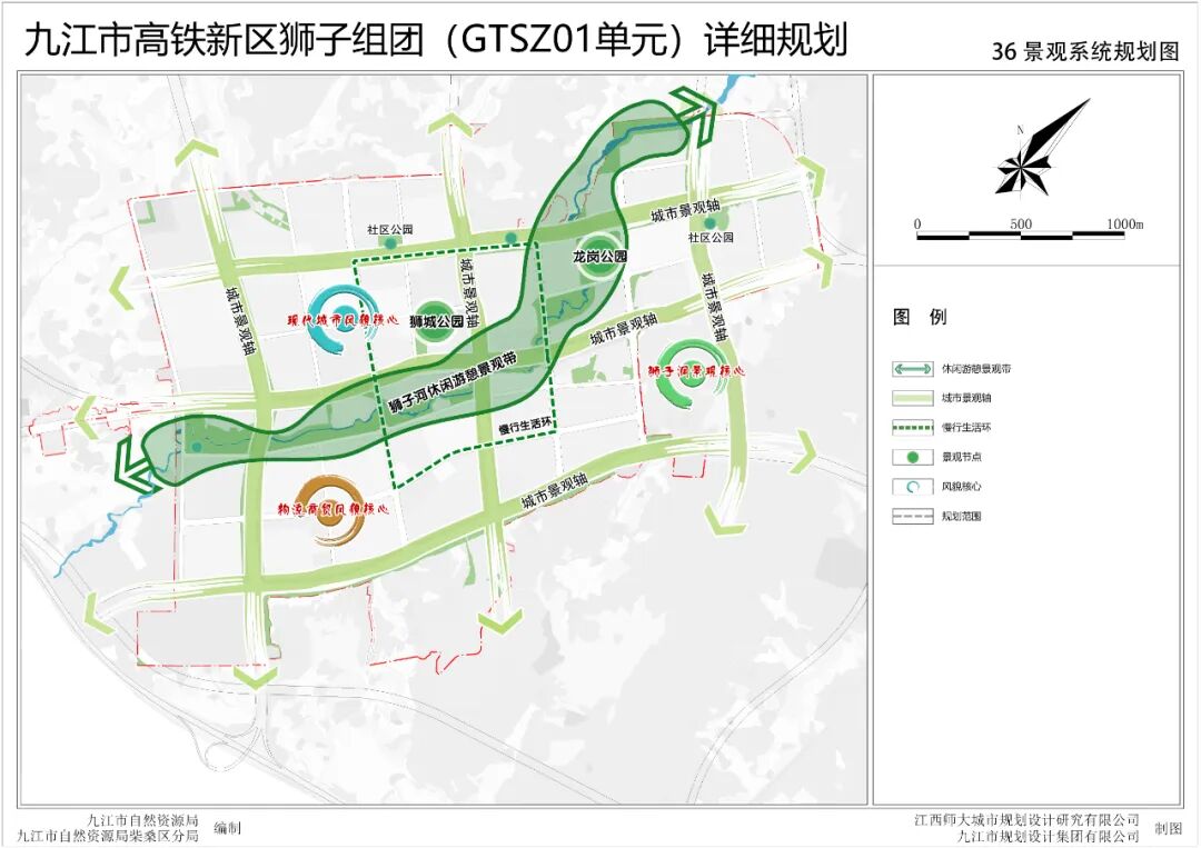 高速:紧邻规划区南侧有杭瑞高速,并设有高速公路出入口,通江大道与高速出入口连接。铁路:规划区距离庐山高铁站仅3公里,高铁大道、双瑞路与庐山高铁站连接。九江快速路:九江快速路在规划区东侧穿境而过,向北联系九江西站、长虹西大道,向南联系庐山站(庐山南站)、庐山机场,是九江市近期重点建设项目。其他对外联系道路:南外环路利用原301省道部分路线,结合柴桑区整体道路系统规划路线,向西联系瑞昌县,向东联系沙城工业园。规划区内高铁大道、双瑞路、通江大道、纵一路、纵二路等主干路网联系城市其他区域。主干路网:规划形成“两横三纵”主干路网结构。“两横”为高铁大道、双瑞路;“三纵”为通江大道、纵一路、纵二路。次干路网:规划次干路共6条,分别为公园南路、住岭路、梅岭路、狮城路、龙岗路、公园北路等6条次干路网。八、景观系统规划