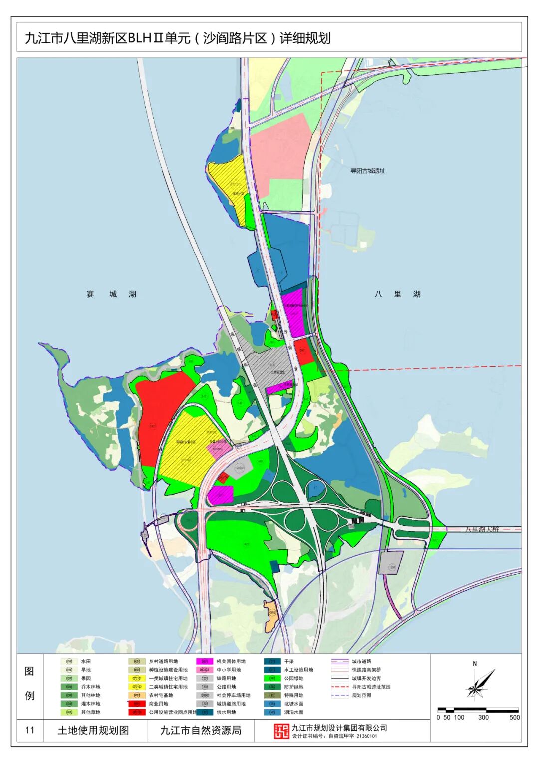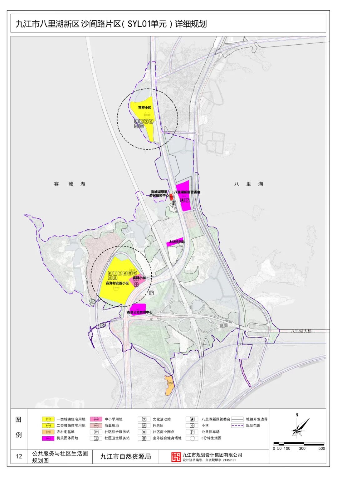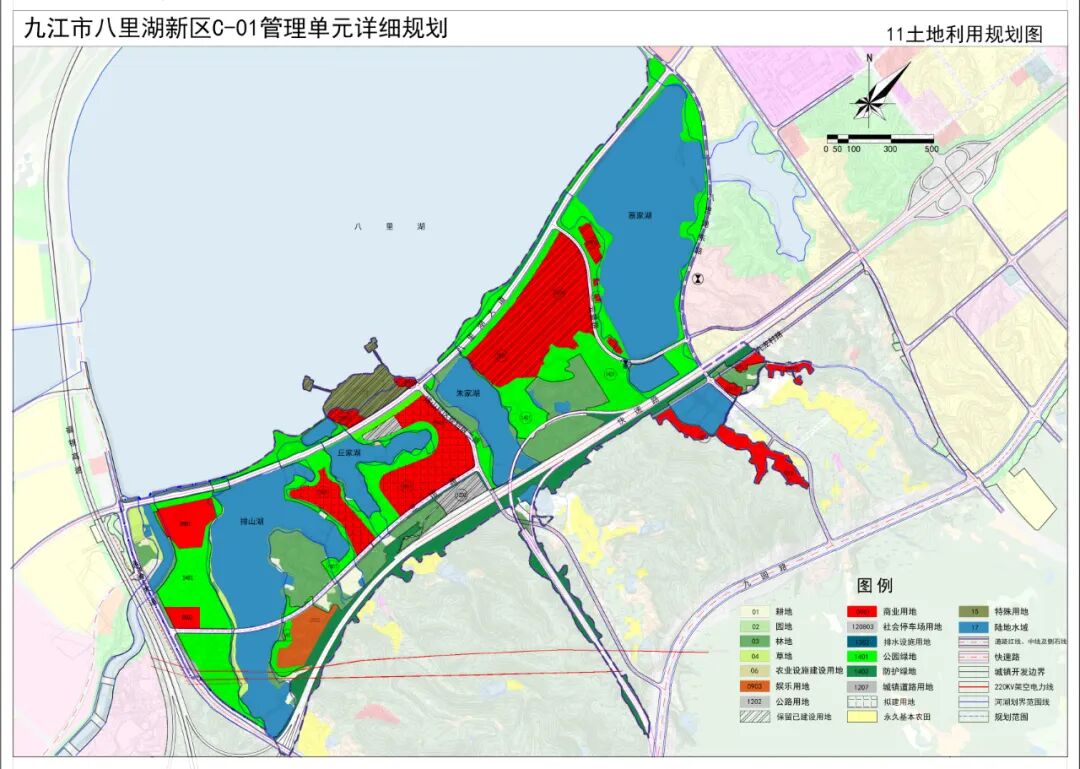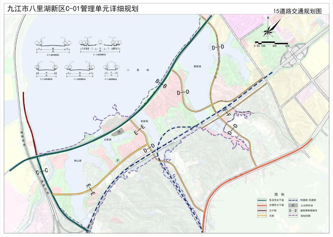 规划保留现状住宅用地18.90公顷,占总用地7.17%。结合社区生活圈,规划形成2个5分钟社区生活圈。规划安排公共管理与公共服务用地6.47公顷,占总用地2.45%。主要为教育用地和机关团体用地。机关团体用地:规划保留现状机关团体用地,包括八里湖新区管委会、木材检测站和江西高速交警用地,面积约5.24公顷。教育用地:保留赛湖小学,面积1.23公顷,班级规模6班。为赛湖村安置小区就近入学提供服务。规划安排商业服务业用地13.64公顷,占总用地5.17%。规划4处商业服务设施,其一为现状赛城湖绿道游客服务中心,作为绿道管理、商业服务、休闲游憩、科普教育、交通换乘和安全保障等相关配套设施集中区;其二为八里湖新区管委会南侧规划的商业用地,为提升门户形象与滨水片区活力,借助片区的资源禀赋,打造集商业服务、文化、休闲交融的文旅项目,商业为居民和游客服务,文化为游客建立情感链接;其三为赛城湖安置小区以北,赛城湖畔的商业用地,此区域水清岸绿,视野开阔,适宜打造休闲康养度假地;其四为沿沙阎路东侧建设一处加油加气站。规划共安排交通运输用地62.19公顷,占总用地23.58%。作为门户所在地,此处不仅有城镇道路以及公共停车设施用地,还有高速公路、南浔铁路线等对外交通设施用地。规划共安排公用设施用地1.12公顷,占总用地0.43%。主要为规划的1处给水泵站,和八里湖岸水工设施用地。另有2处已建的污水提升泵站结合绿地设置。规划共安排绿地与开敞空间用地65.05ha,占总用地24.67%。规划区自然资源丰富,滨水岸线优美,适宜打造各类开敞空间。主要开敞空间为八里湖西郊公园以及沿沙阎路两侧的带状绿地,与周边的生态景观融为一体,打造疏朗开阔的景观空间。规划共安排特殊用地0.13ha,占总用地0.05%,为现状保留的一处宗教设施用地。七、综合交通规划
